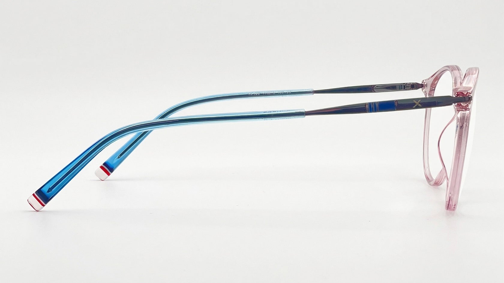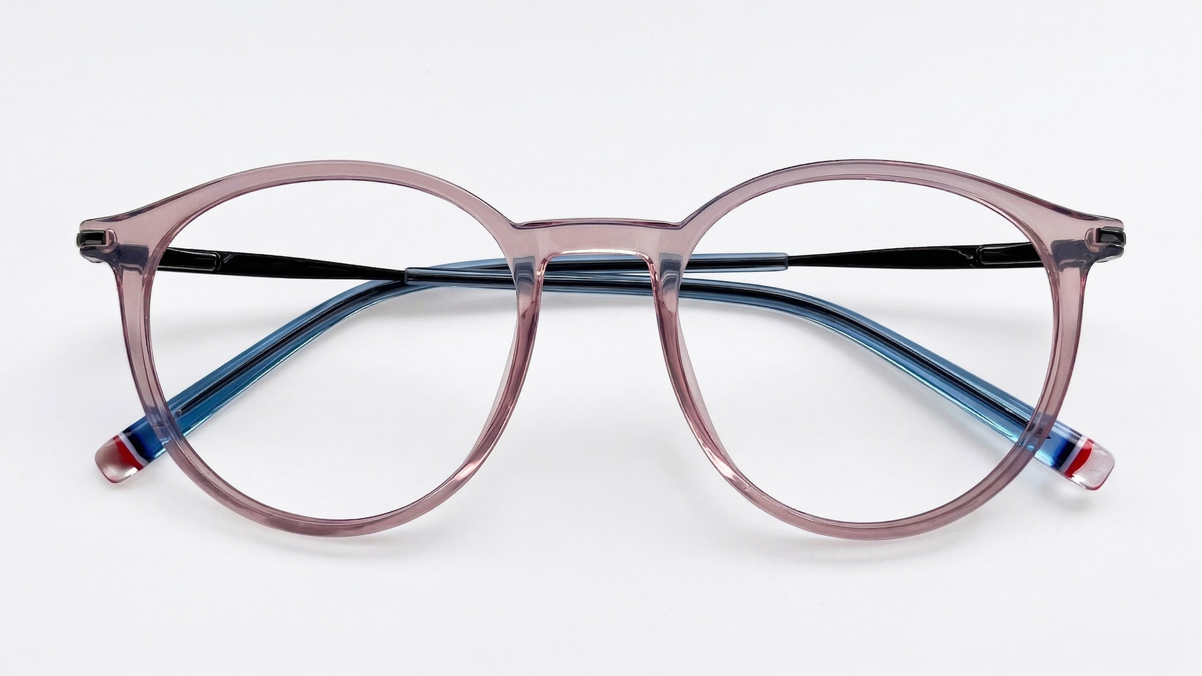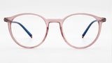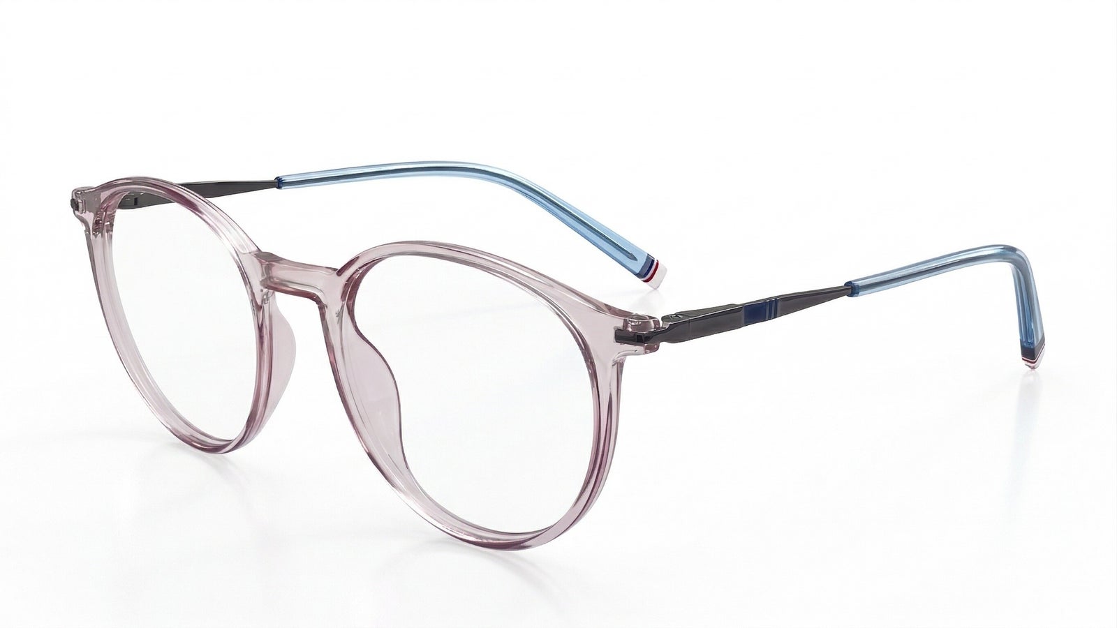 Montura masculina redonda azul claro con gris y transparente, en metal con TR90, tamaño mediano, con puente anatómico y diseño ligero moderno.