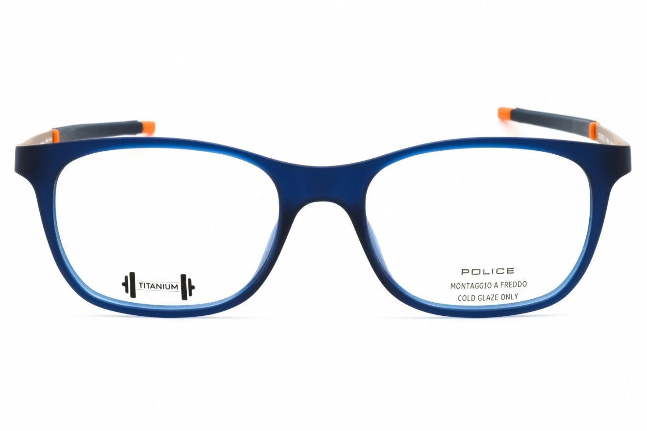 Montura de gafas marca POLICE con forma Cuadradas estilo de marco Completo, de colores Azul, Naranja