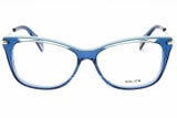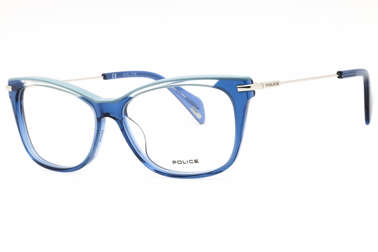 Montura de gafas marca POLICE con forma Agatada estilo de marco Completo, de colores Azul Claro, Plata