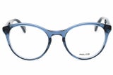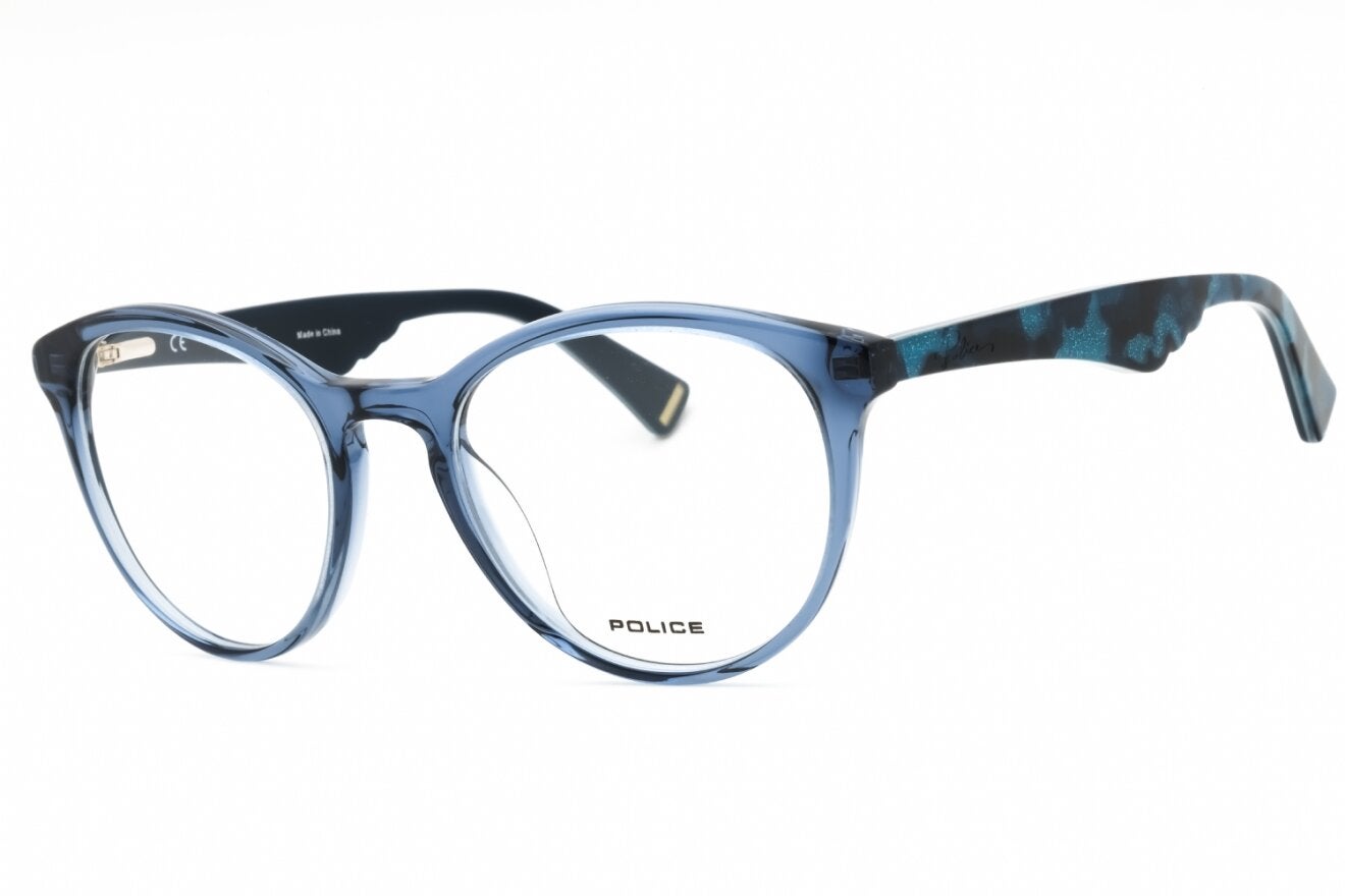 Montura de gafas marca POLICE con forma Redonda estilo de marco Completo, de colores Azul Claro, Azul Oscuro