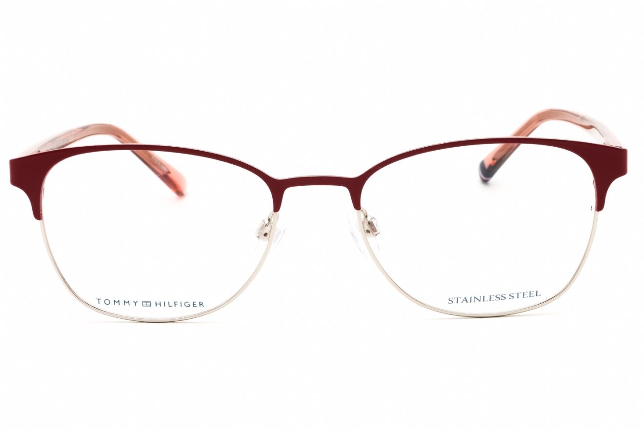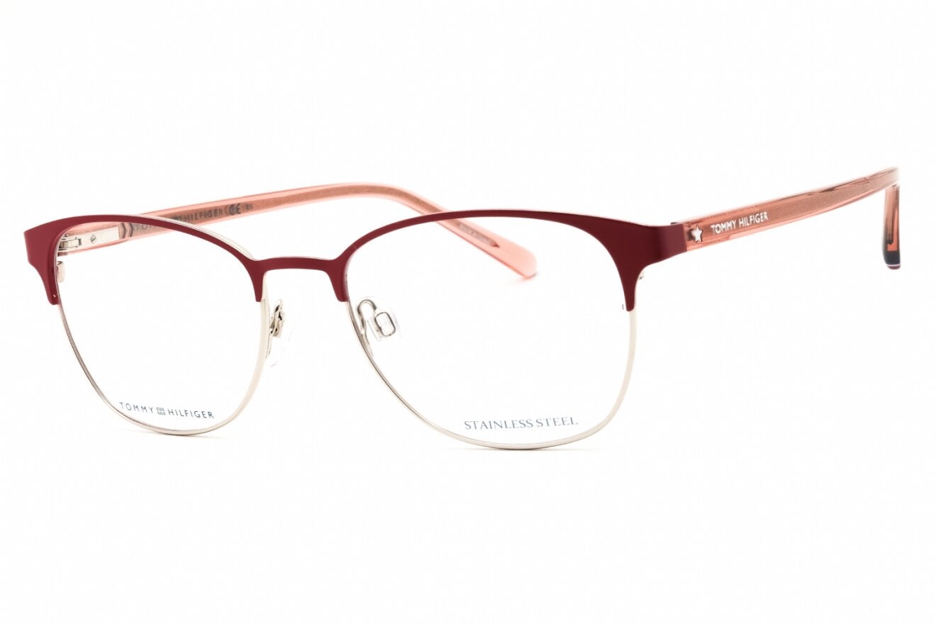 Montura de gafas marca TOMMY HILFIGER con forma Clubmaster estilo de marco Media Montura, de colores Rosado, Vinotinto