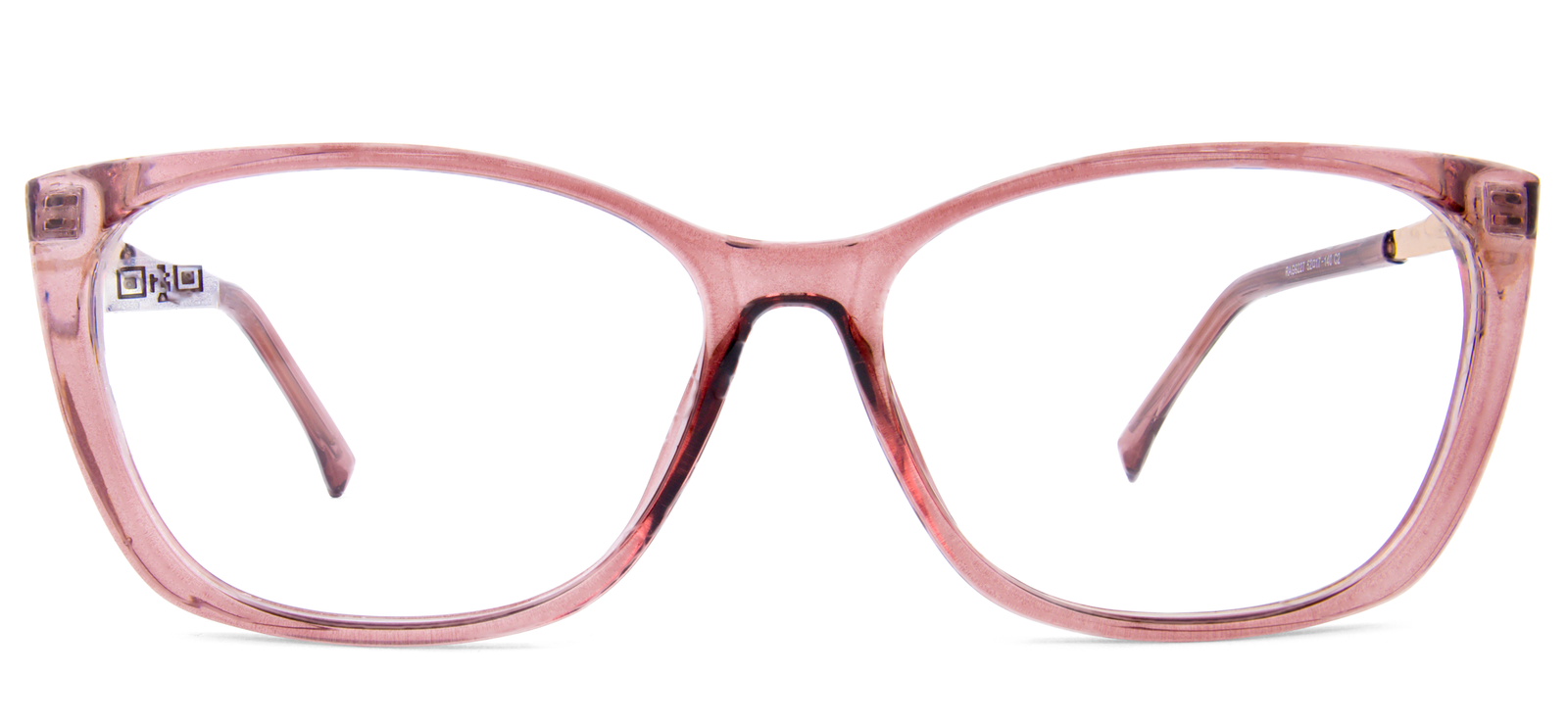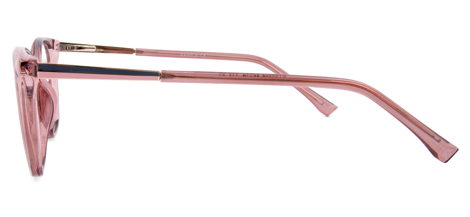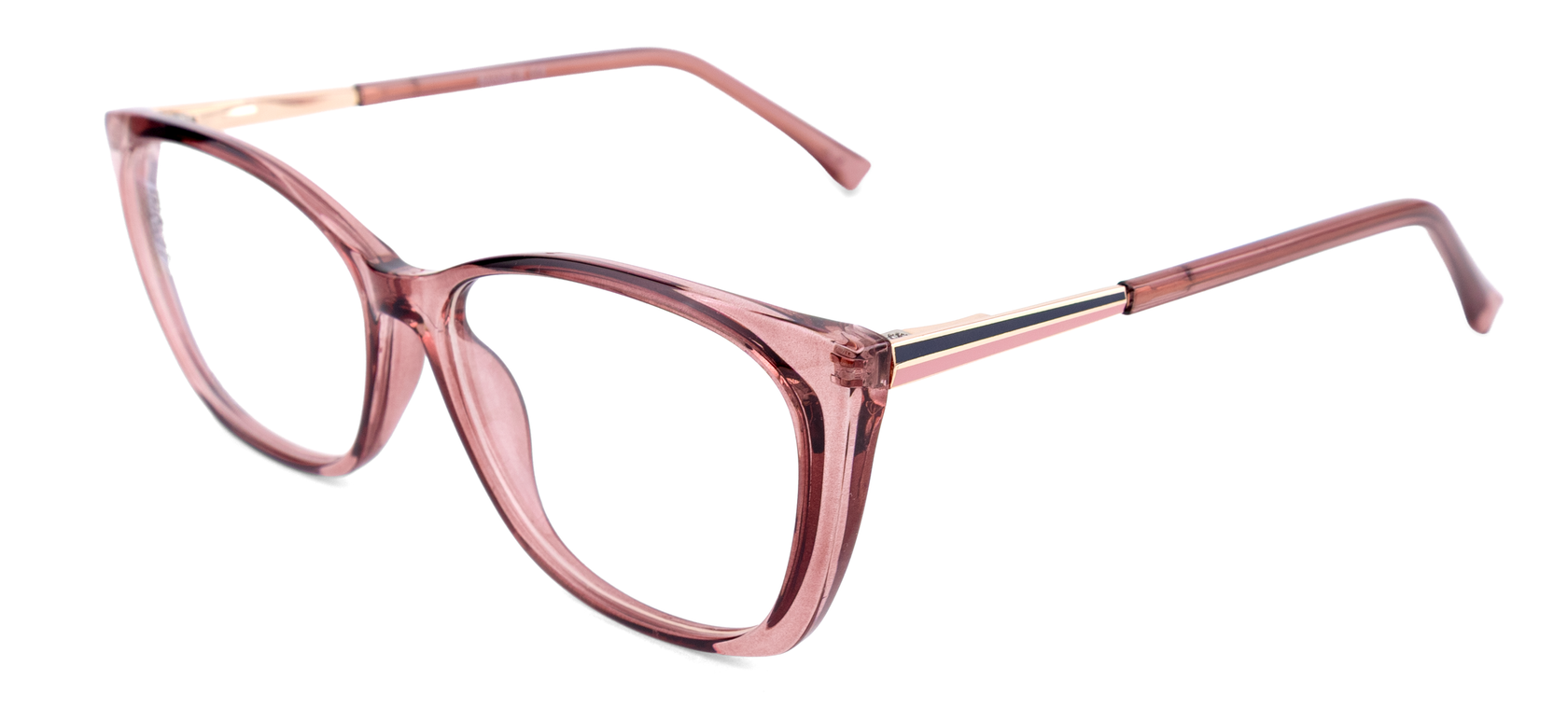 Monturas de mujer en tono rosado con transparencia, combinado con negro y dorado, diseño sobrio y clásico, para usar en todas ocaciones sin deslucir.