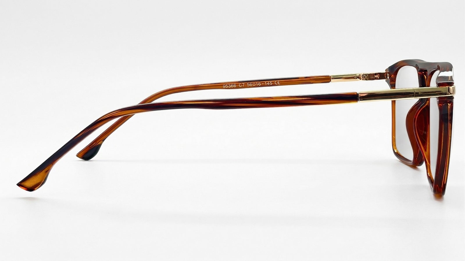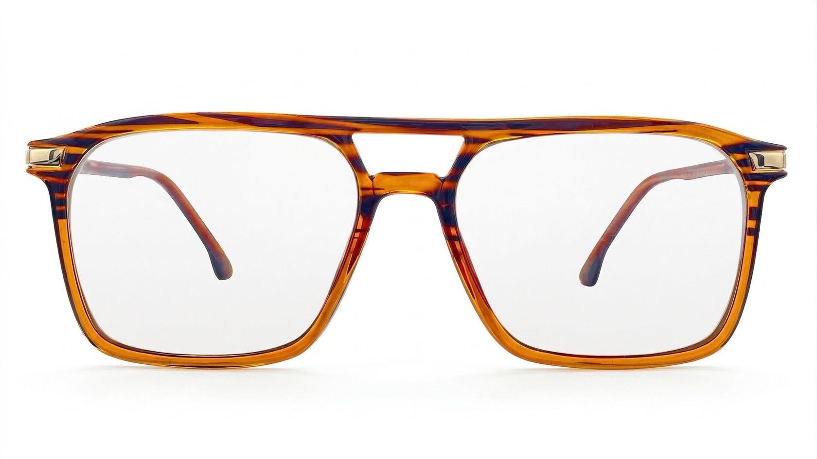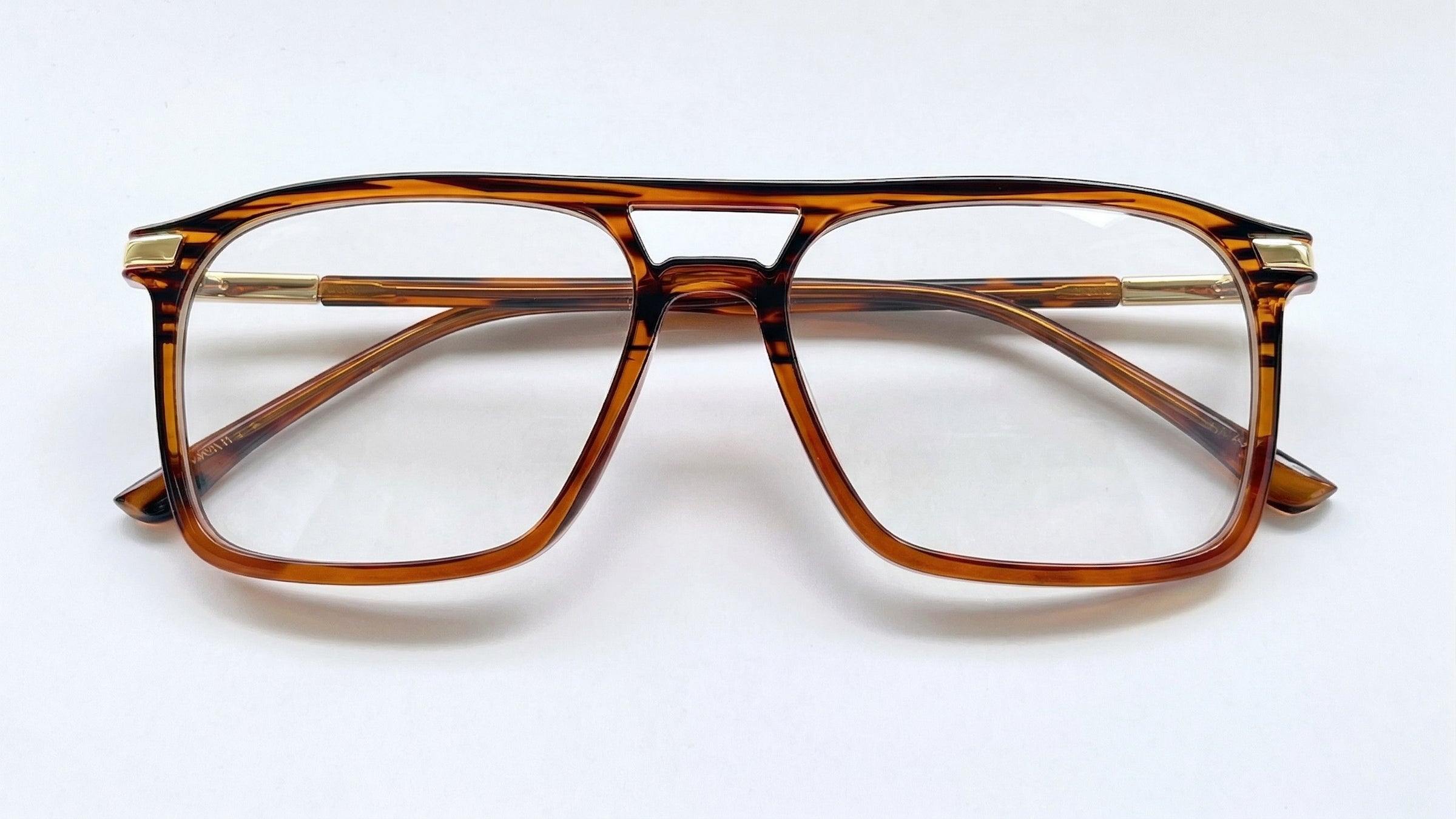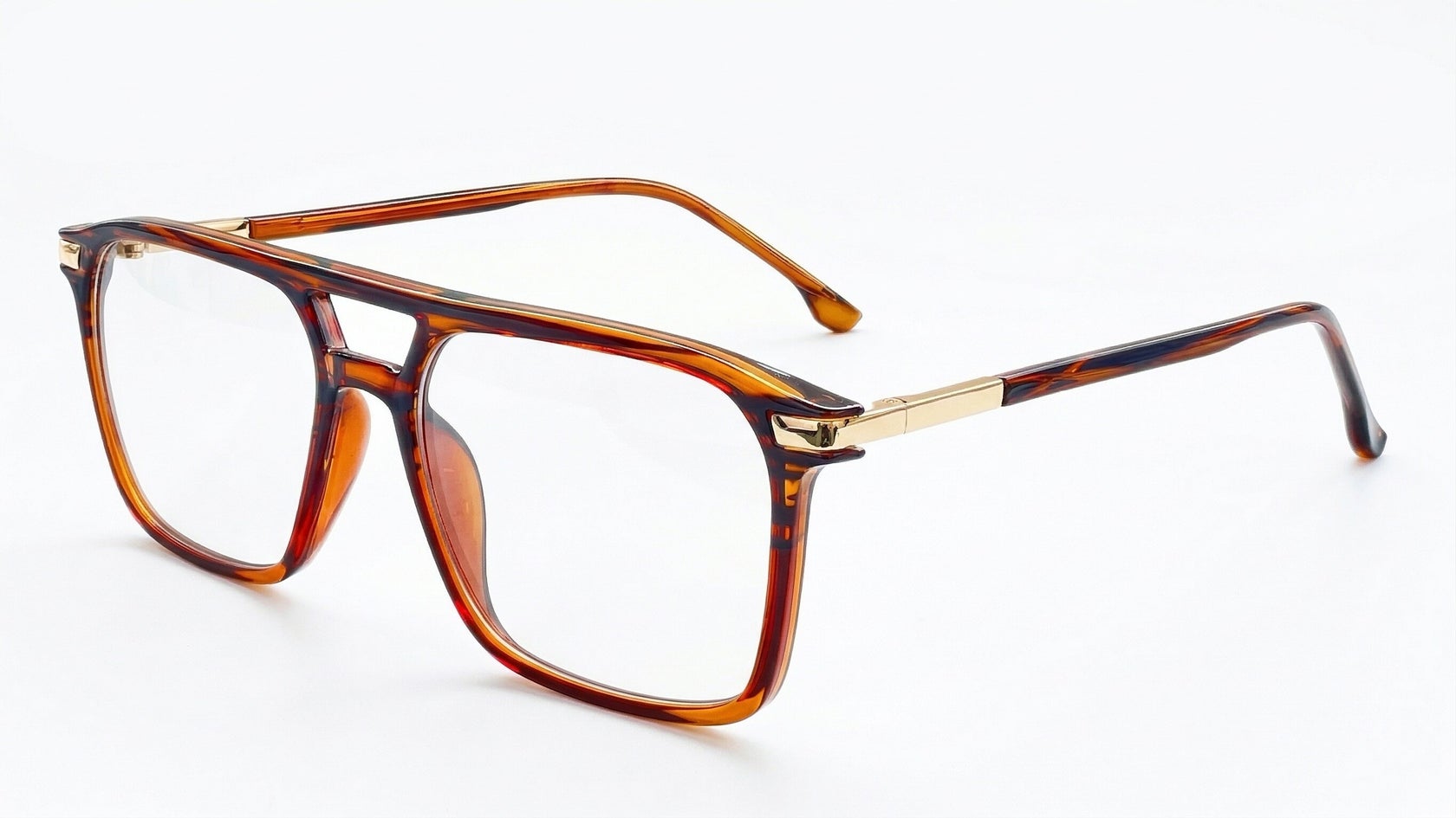 Montura masculina carey miel con dorado, estilo aviador cuadrado, en material TR90, tamaño mediano, con doble puente y varillas delgadas.