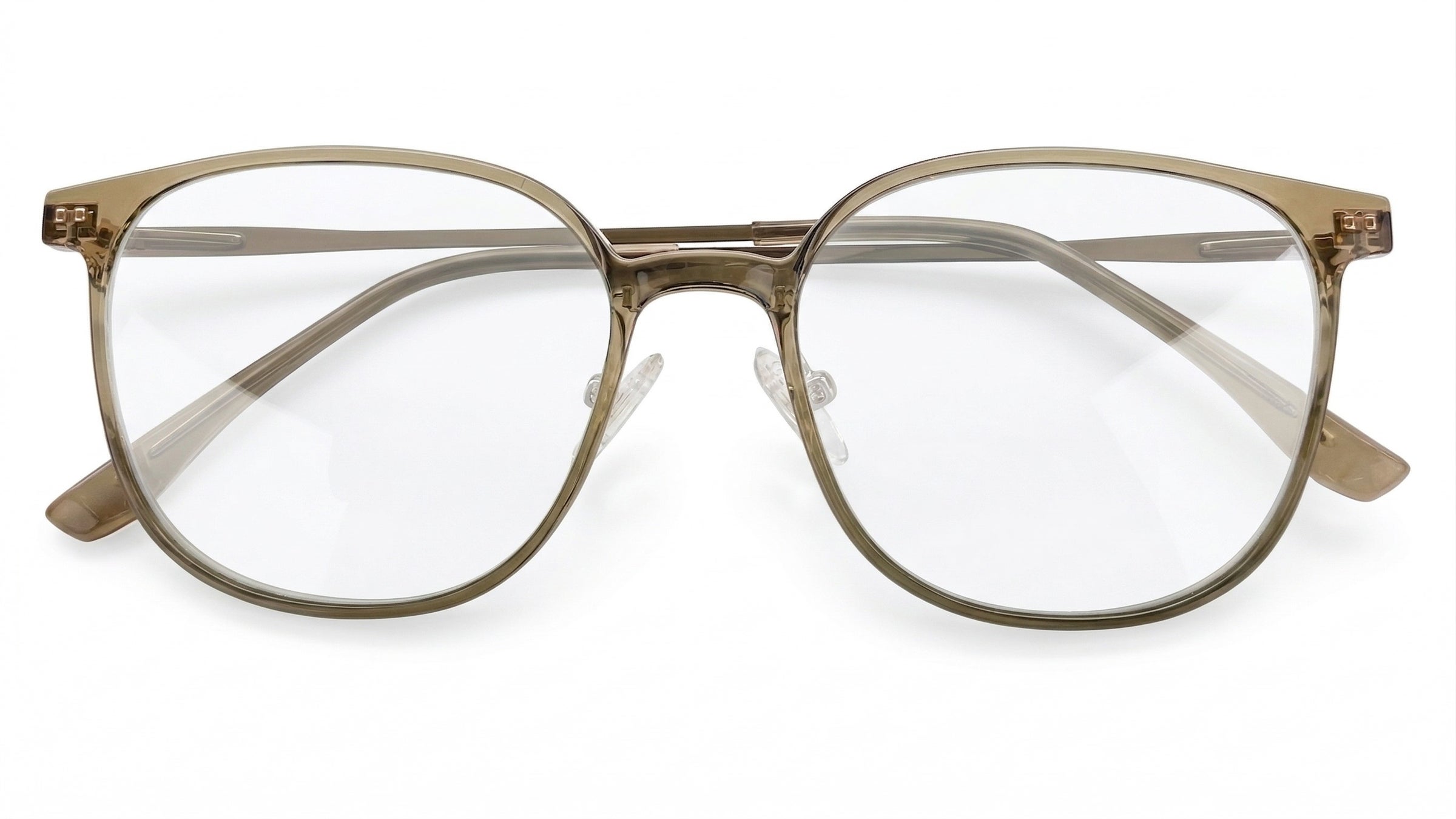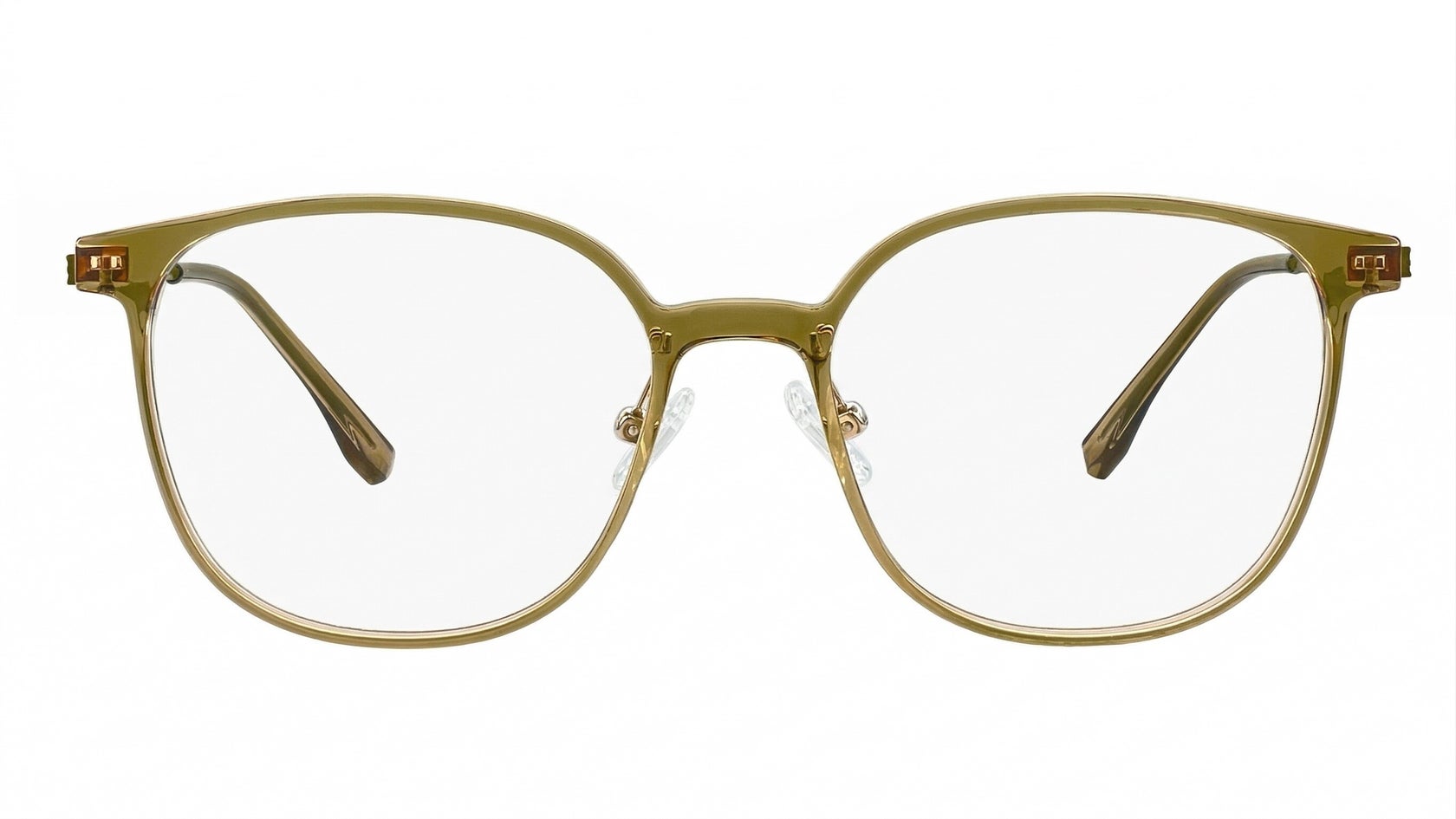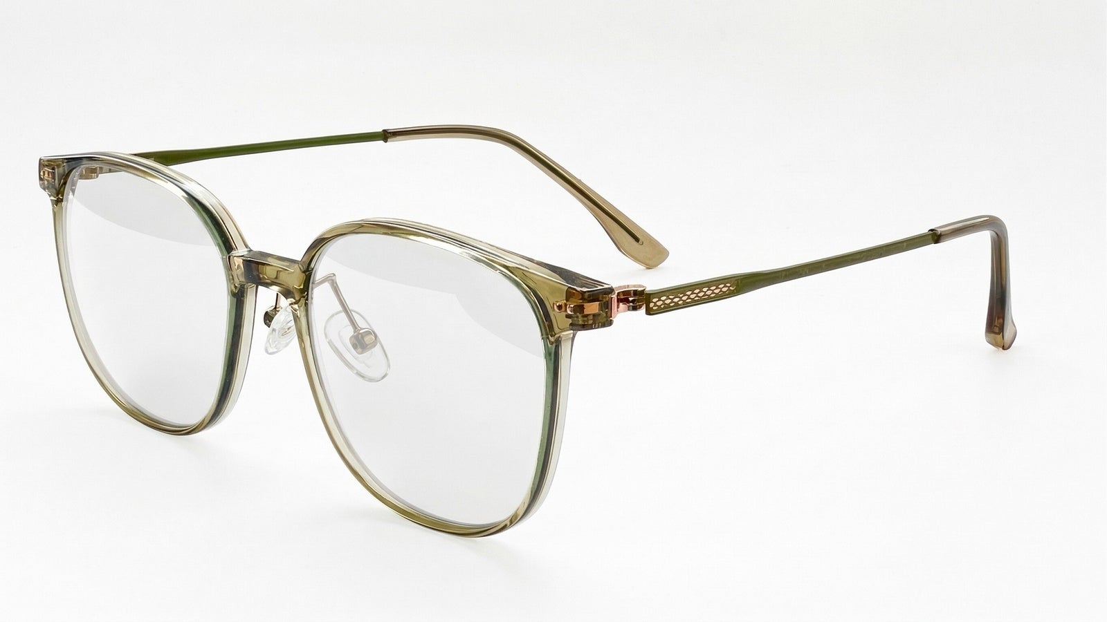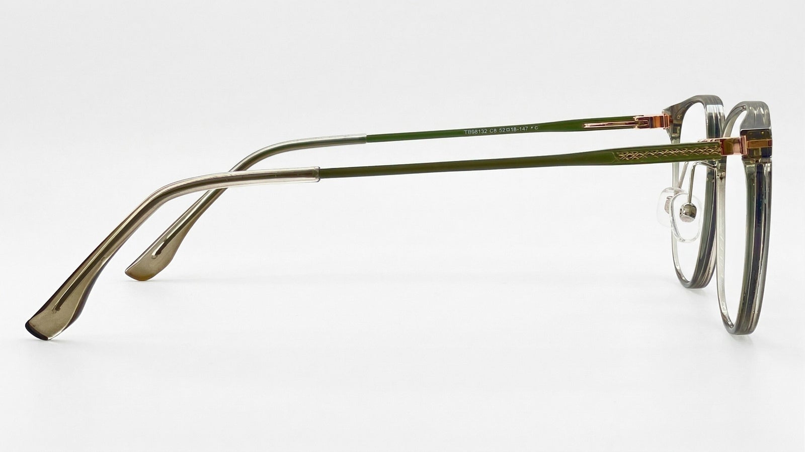Montura femenina verde oscuro con transparencia, forma cuadrada con esquinas redondeadas, en TR90, tamaño mediano y con brazos metálicos.