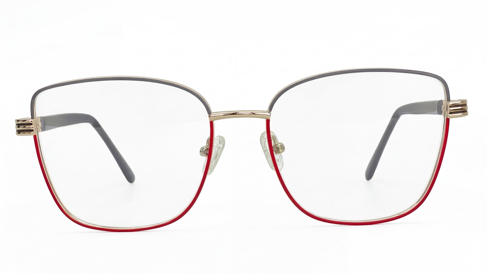 Marco metálico dorado brillante con detalles en rojo en el aro interior, cubre brazo negro con adorno metálico decorativo en los brazos, plaquetas de silicona transparente ajustables