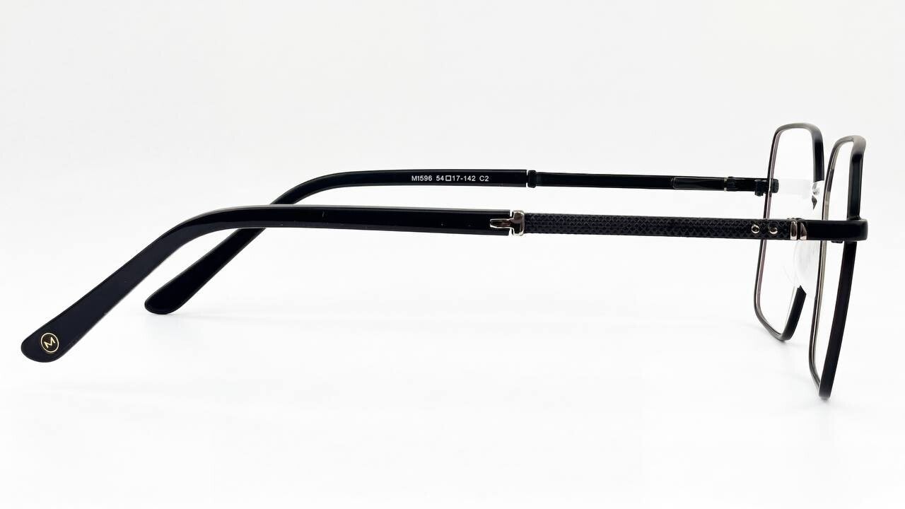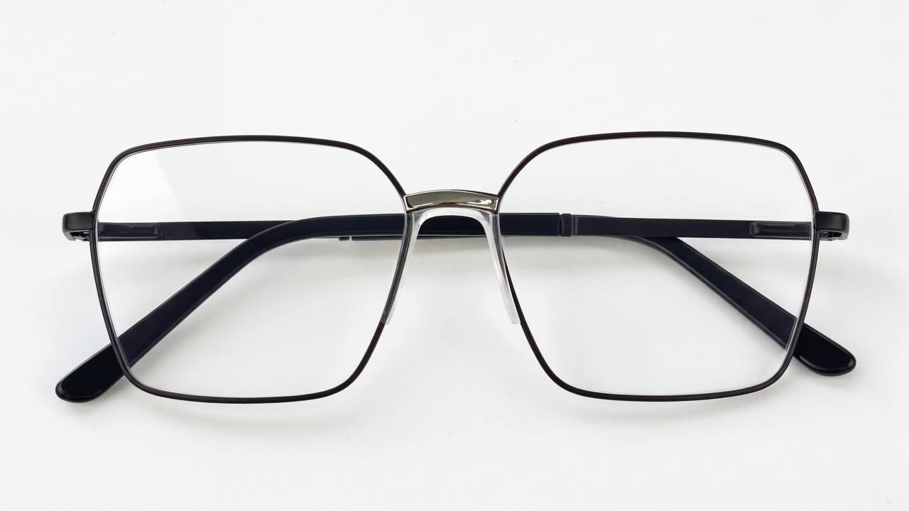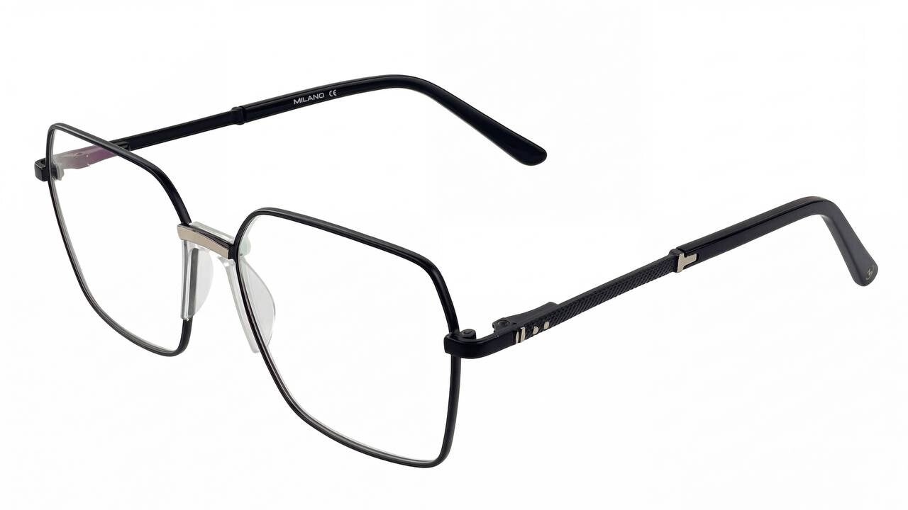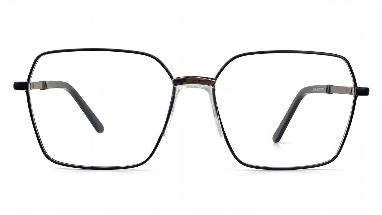 Montura para caballero estilo urbano-ejecutivo en metal negro con detalles plateados. Marco cuadrado oversize con textura microperforada en los brazos, bisagra flex y puente anatómico transparente. Ideal para looks modernos, formales o streetwear sofistic