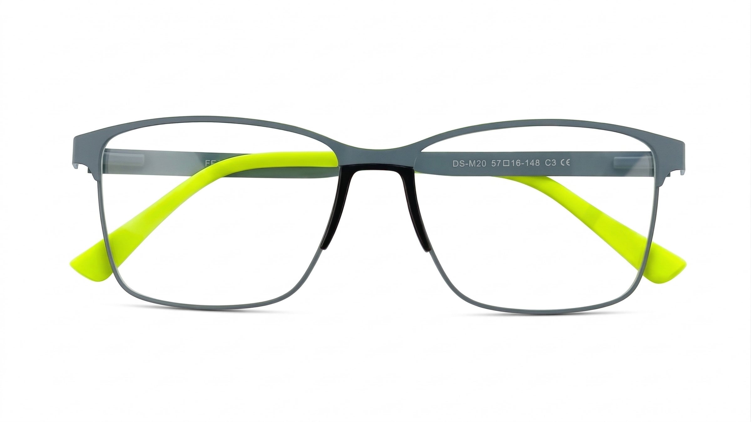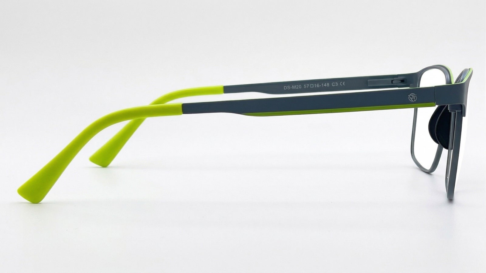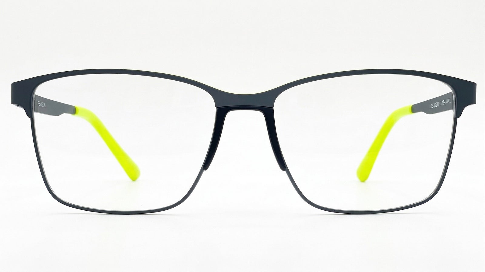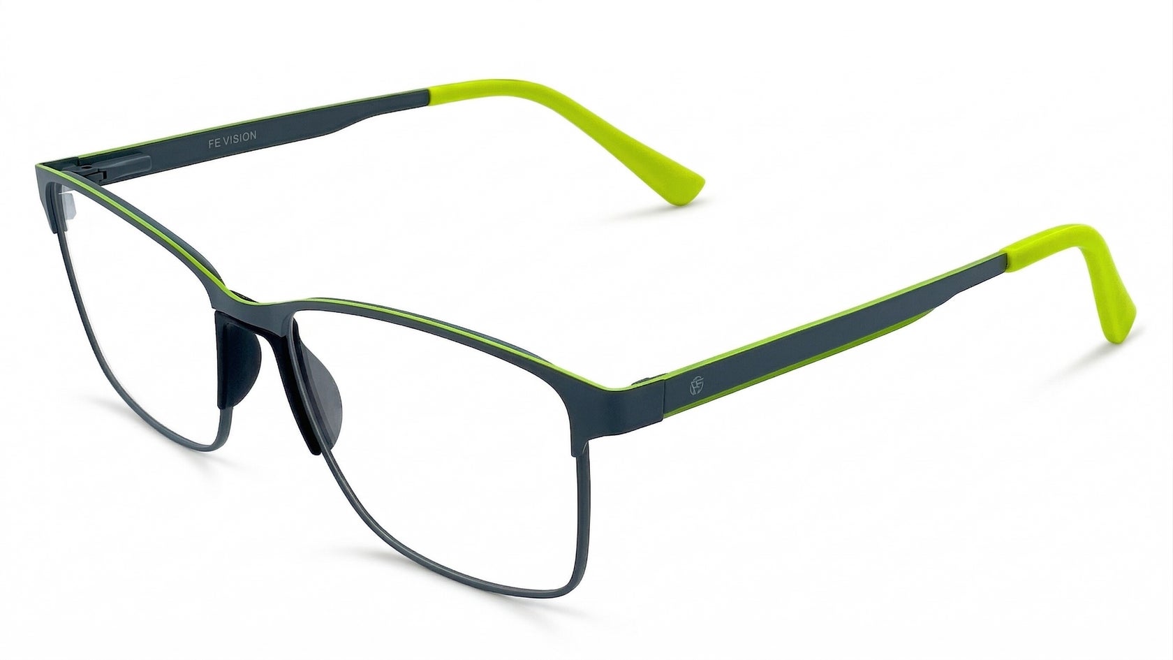 Montura para caballero en metal gris oscuro con puente anatómico, acentos verde lima en brazos y terminales, adorno pintado en brazo. Diseño rectangular, estilo moderno y urbano.