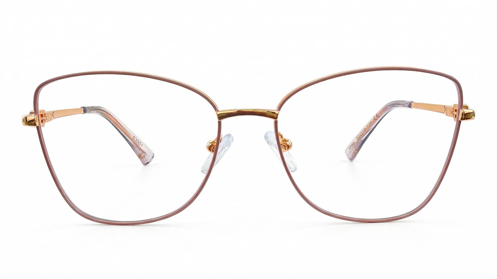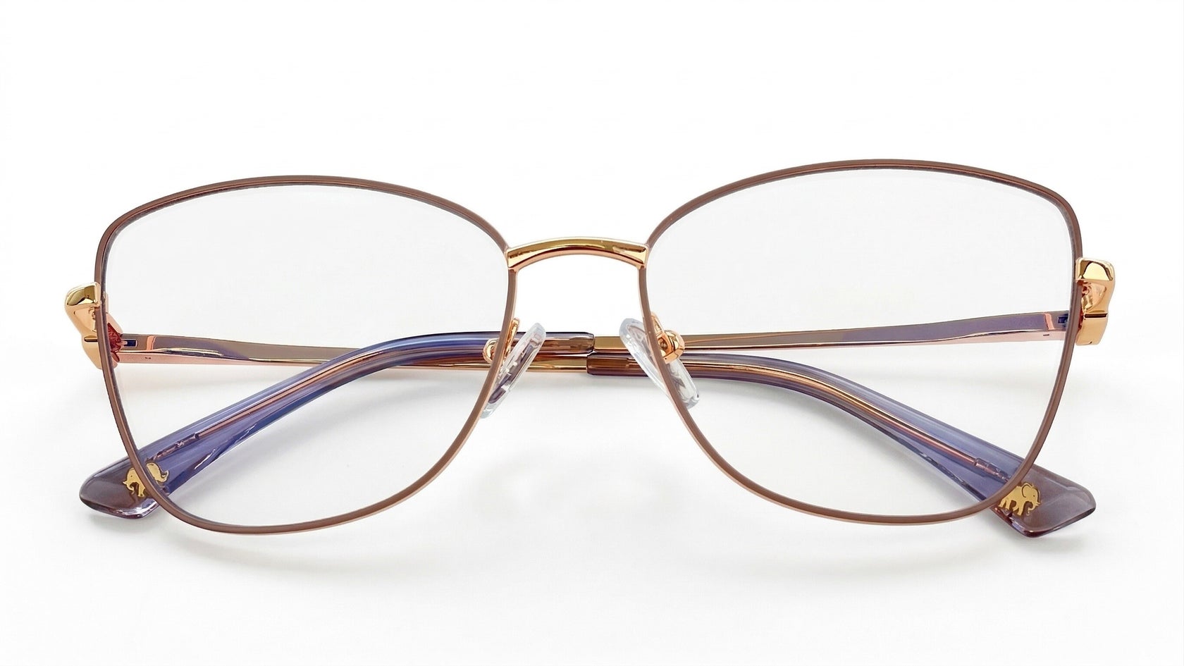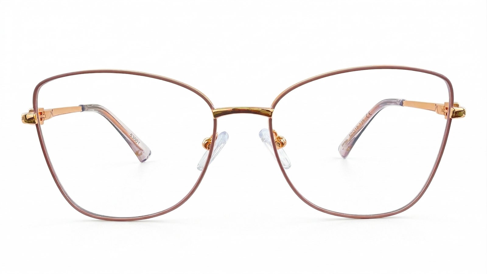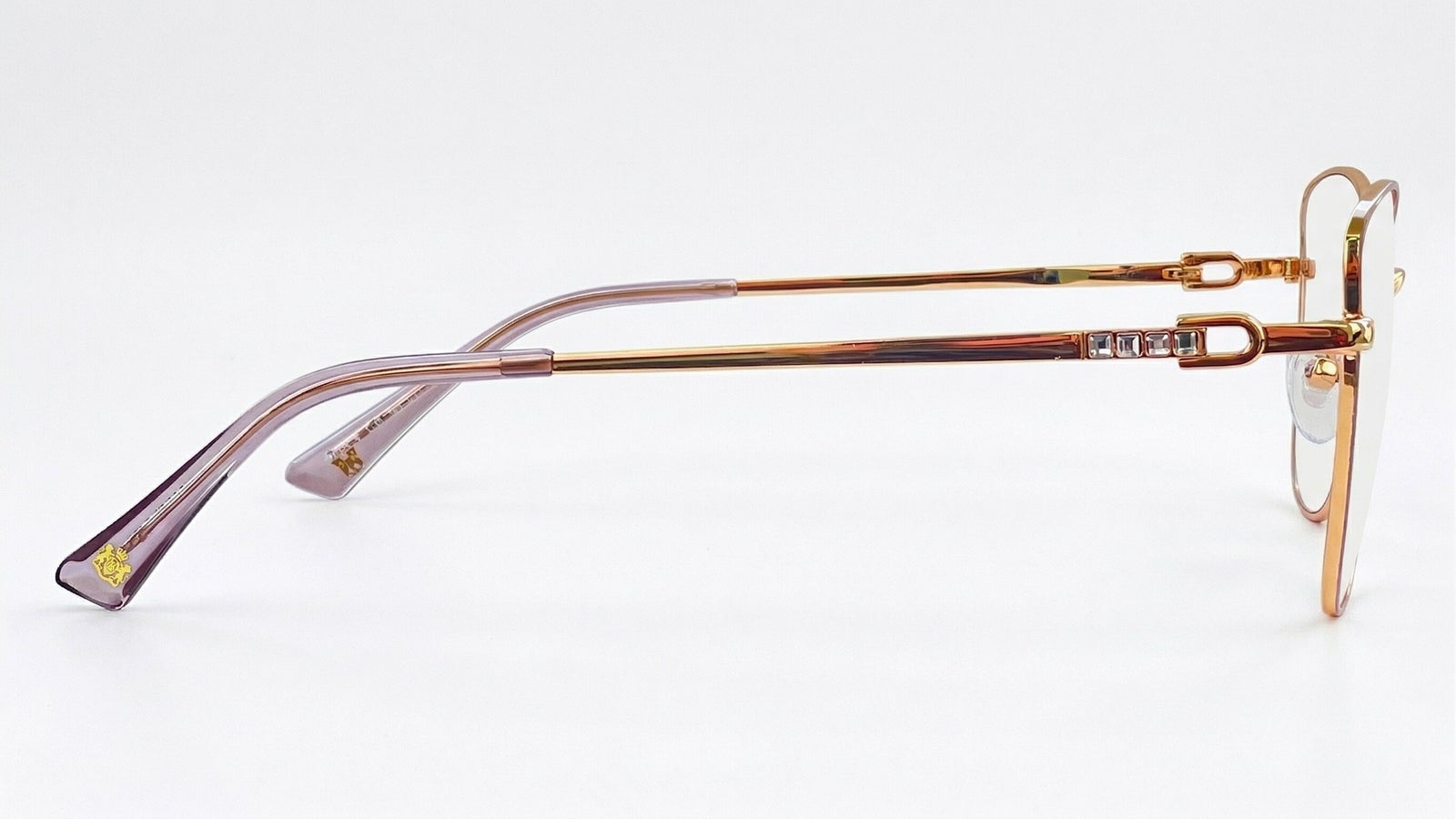 Marco metálico gris con puente dorado, varillas doradas con cristales decorativos en la bisagra, terminales en acetato translúcido, plaquetas de silicona transparente ajustables