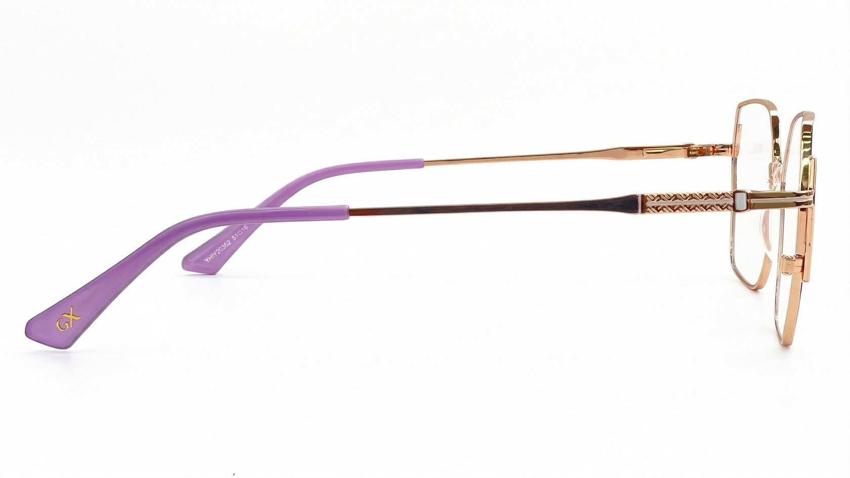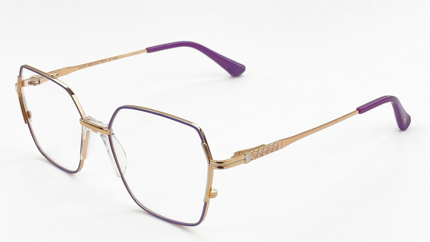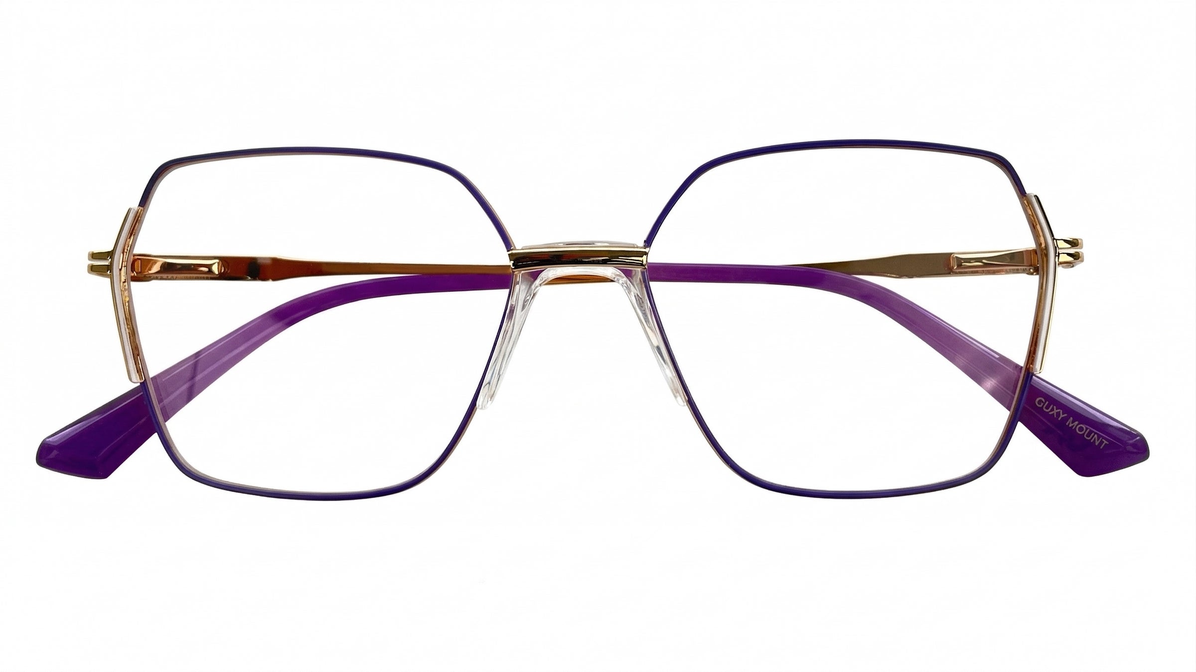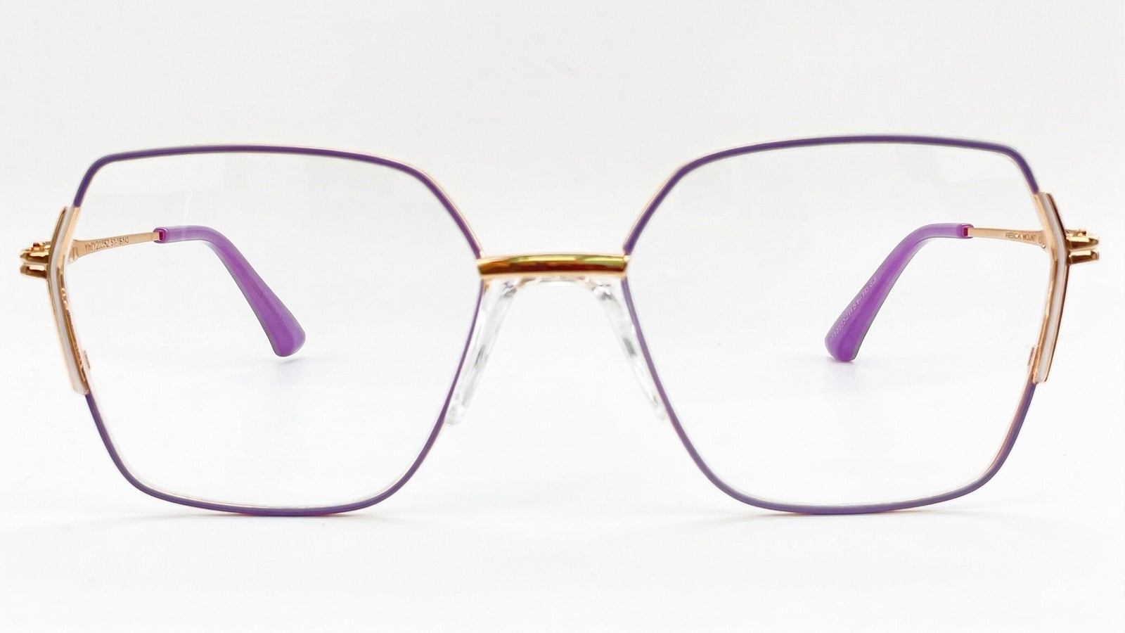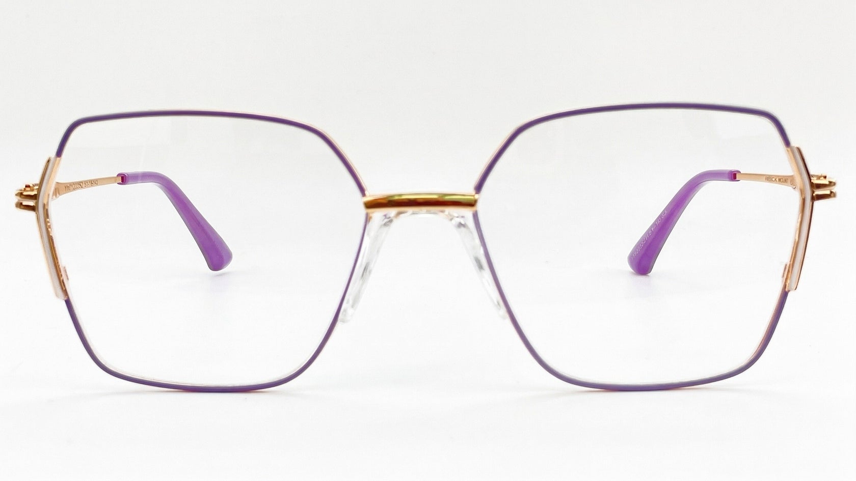 Montura metálica femenina morada con dorado, forma geométrica tipo hexagonal, tamaño mediano, con puente anatómico transparente, varillas delgadas, adorno metálico lateral y terminales morado.