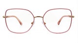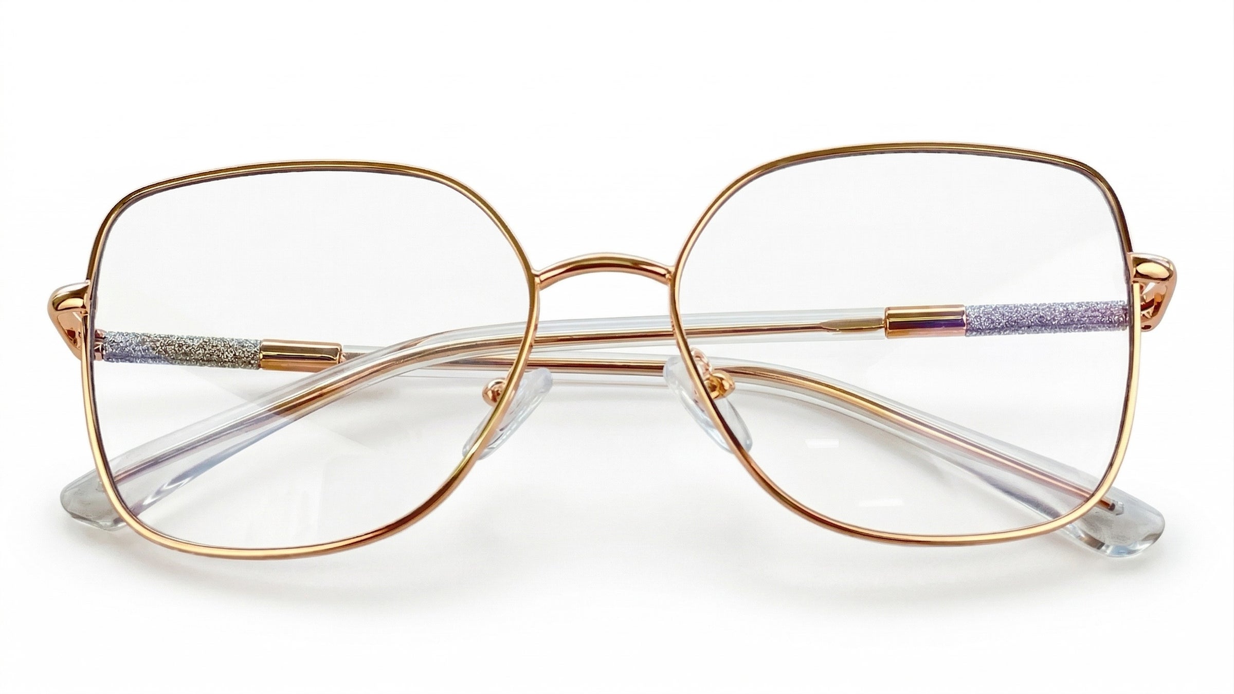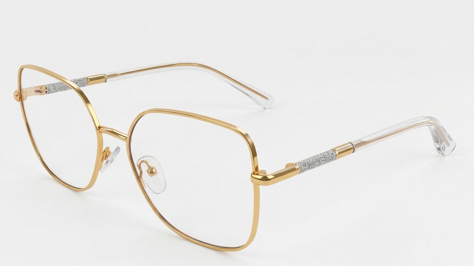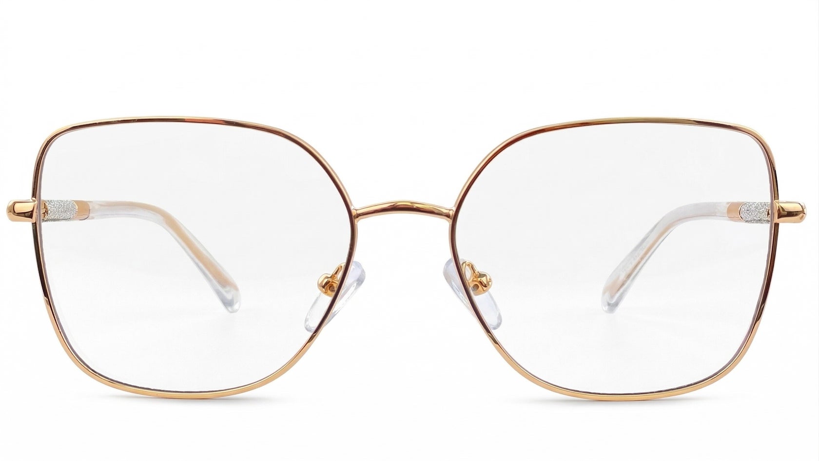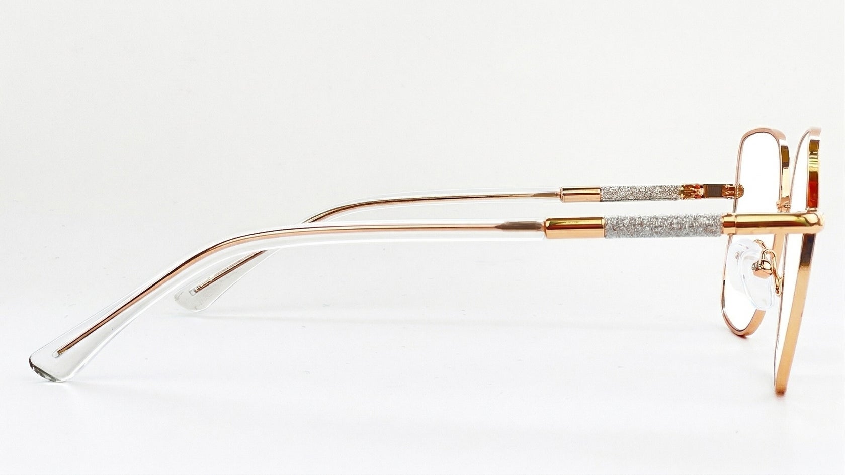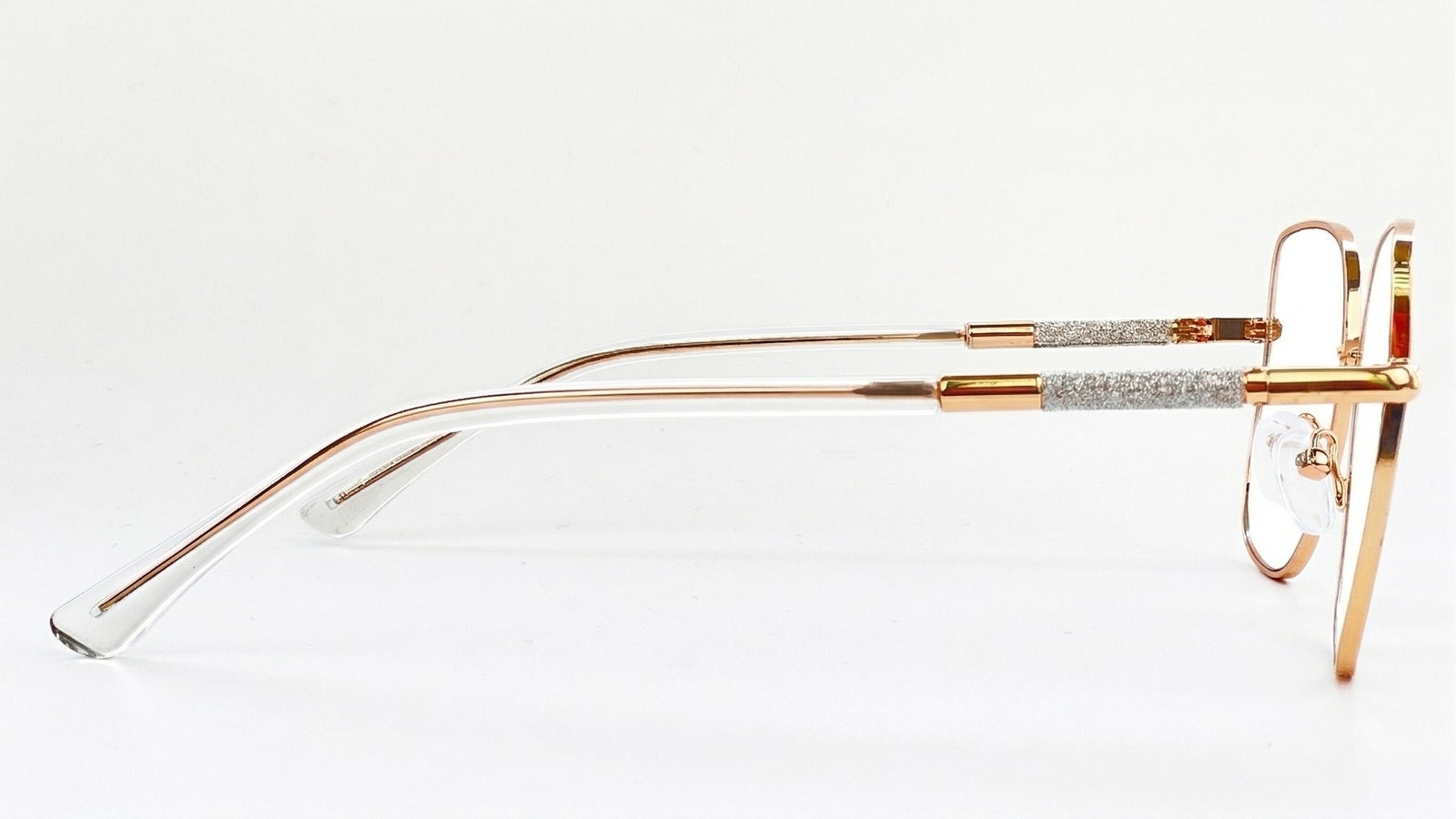 Montura metálica femenina dorado con plata y transparente, de forma cuadrada, tamaño ancho, con plaquetas, frente delgado, varillas estilizadas y escarcha decorativa en los brazos.