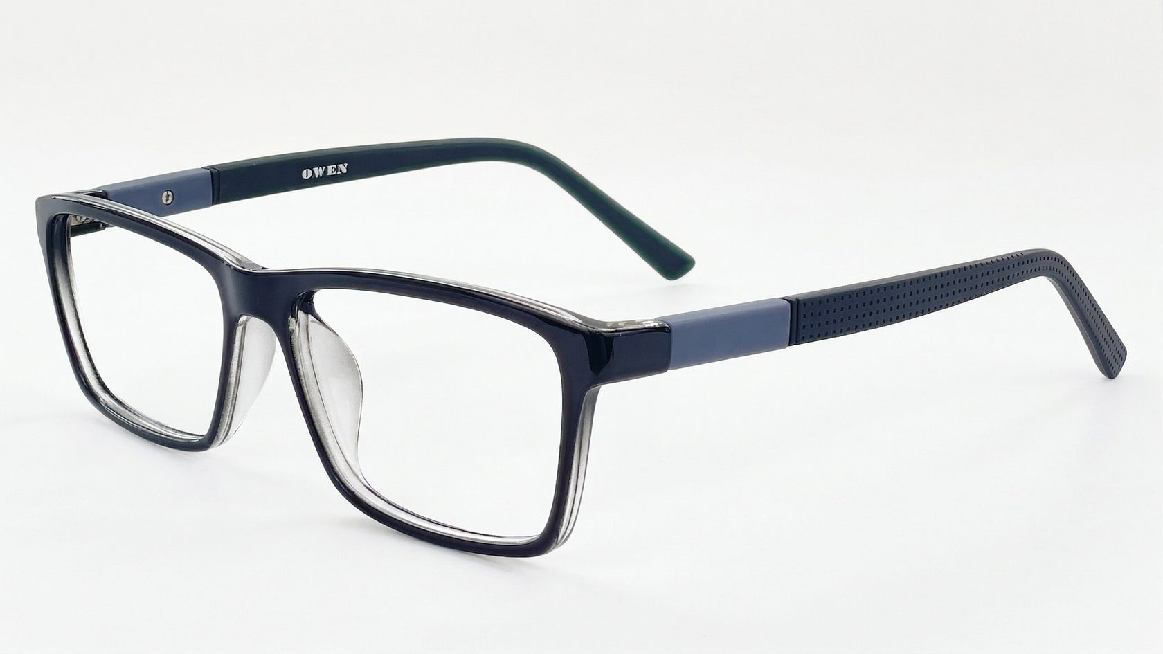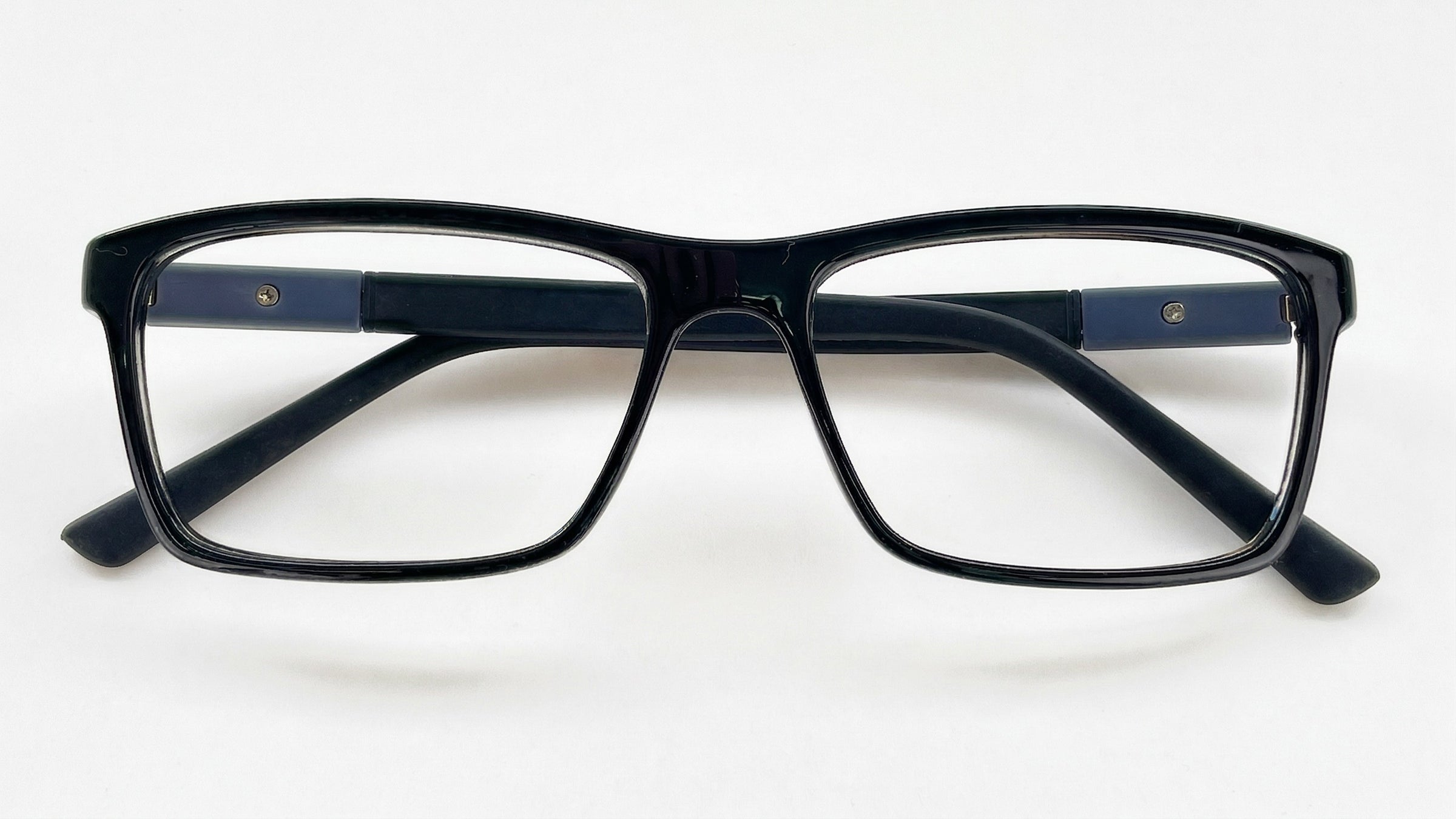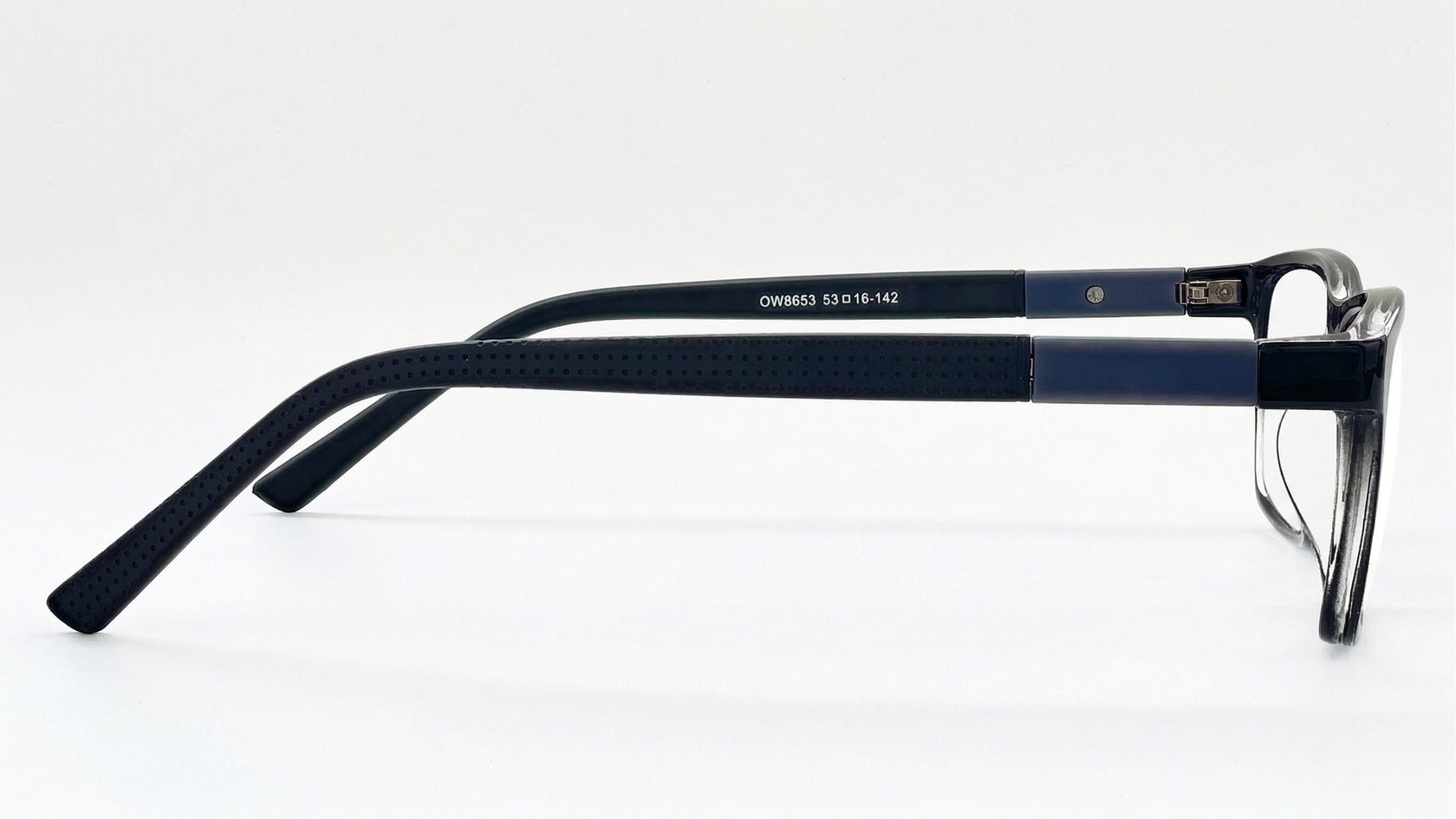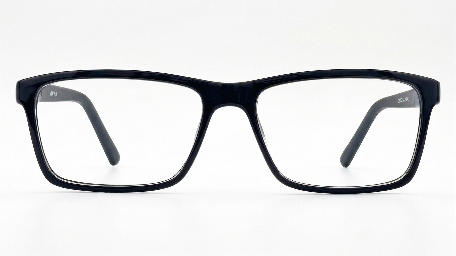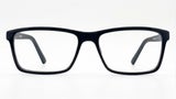 Montura masculina negra de forma rectangular, tamaño mediano, elaborada en acetato, con puente anatómico, frente estilizado y brazos texturizados con diseño microperforado, ideal para un look moderno, sobrio y elegante.