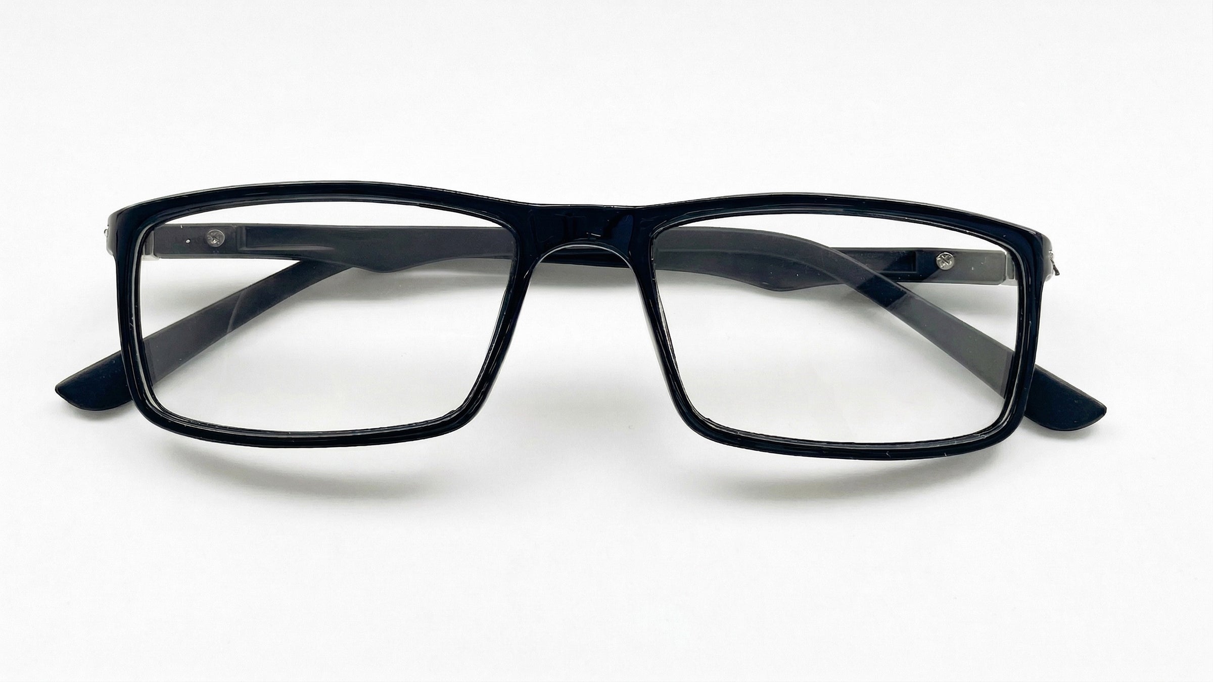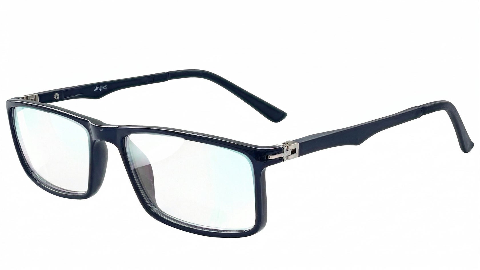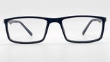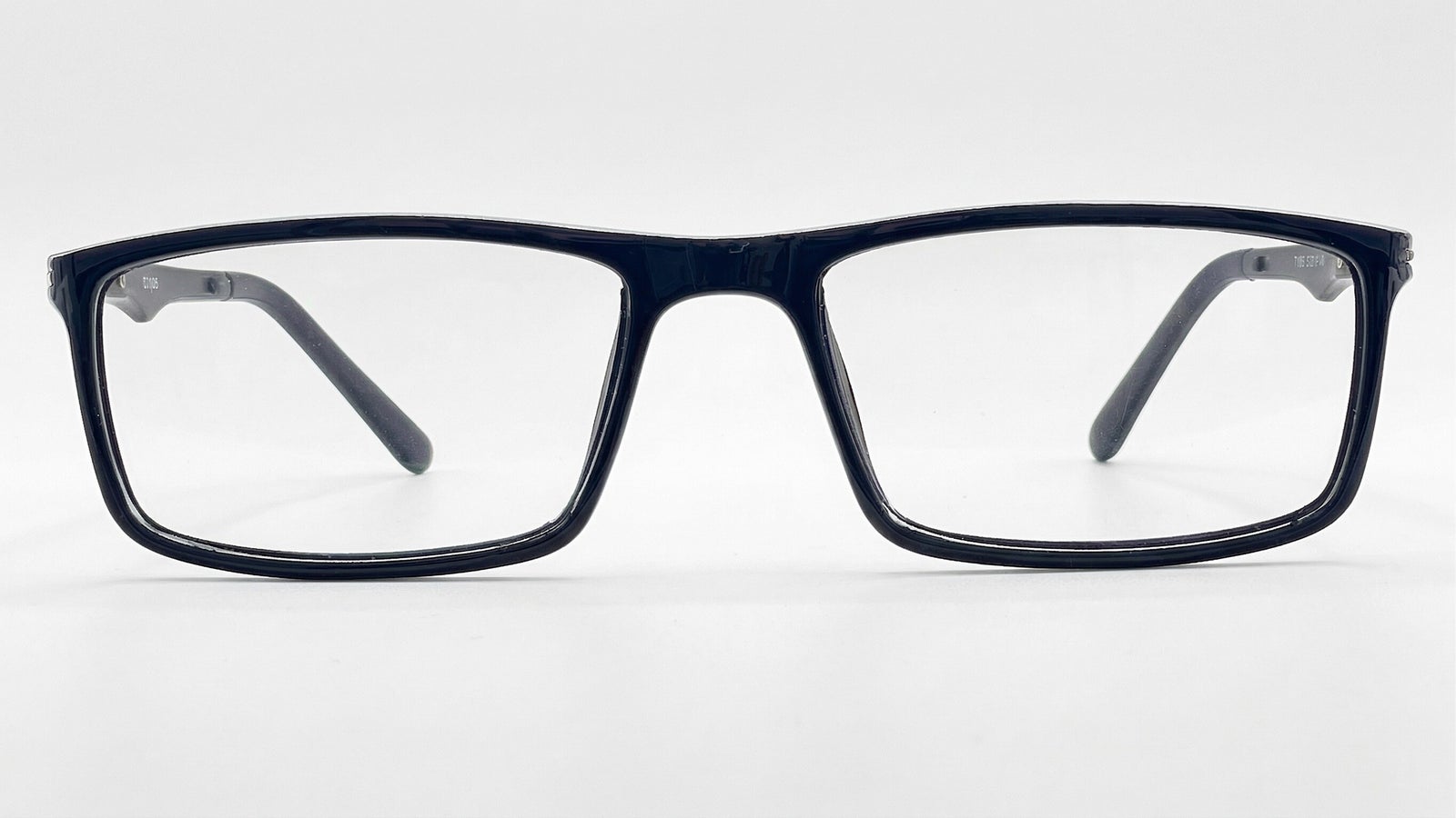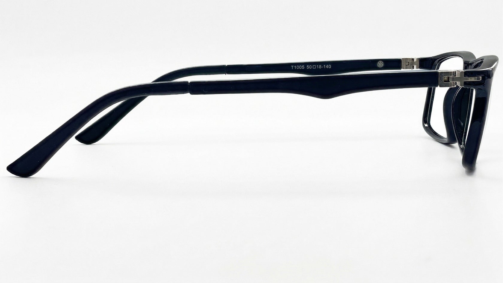Montura masculina negra de forma rectangular, tamaño mediano, elaborada en acetato, con puente anatómico, frente delgado y varillas estilizadas con detalle metálico lateral, ideal para un look sobrio y moderno.