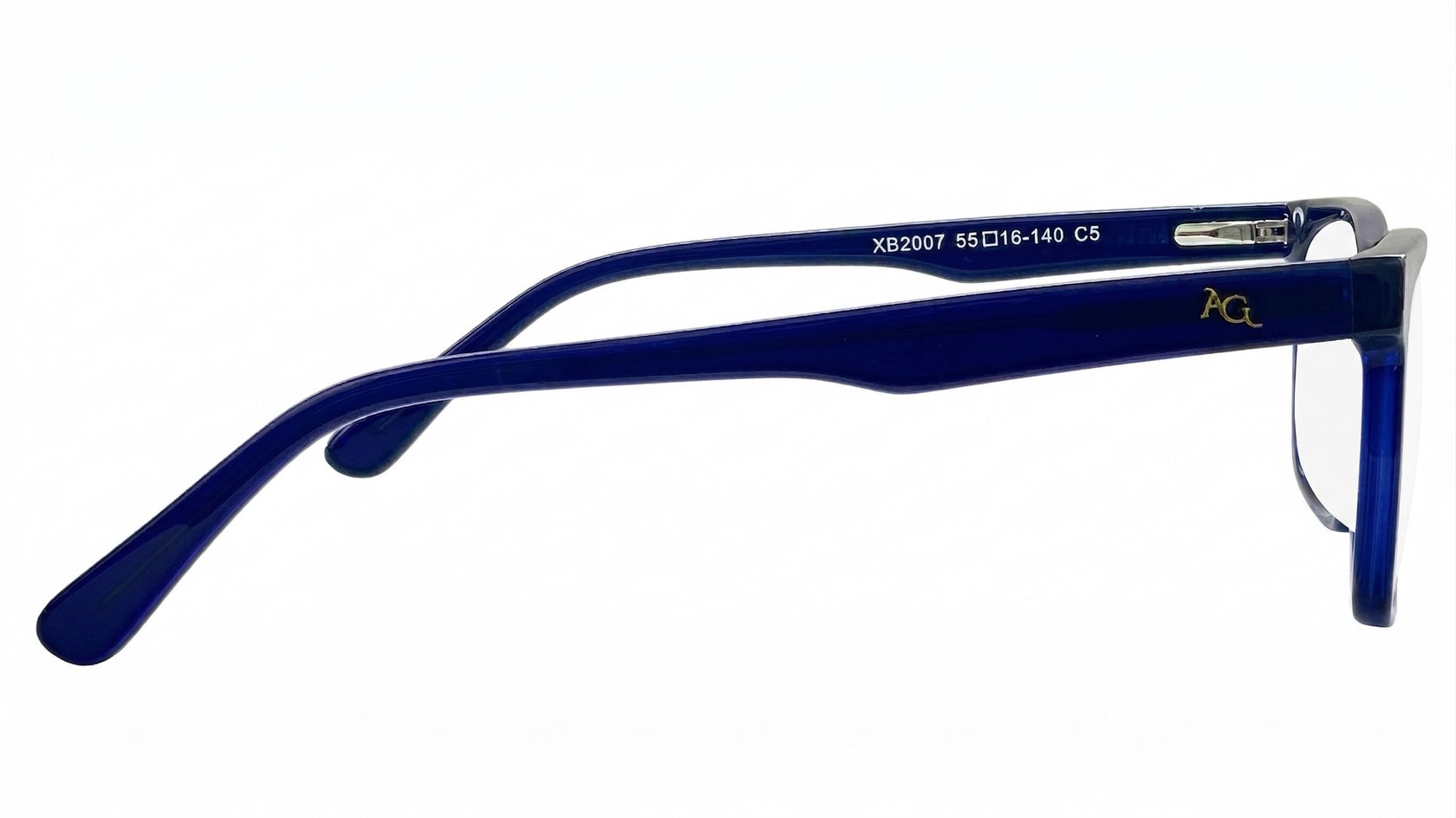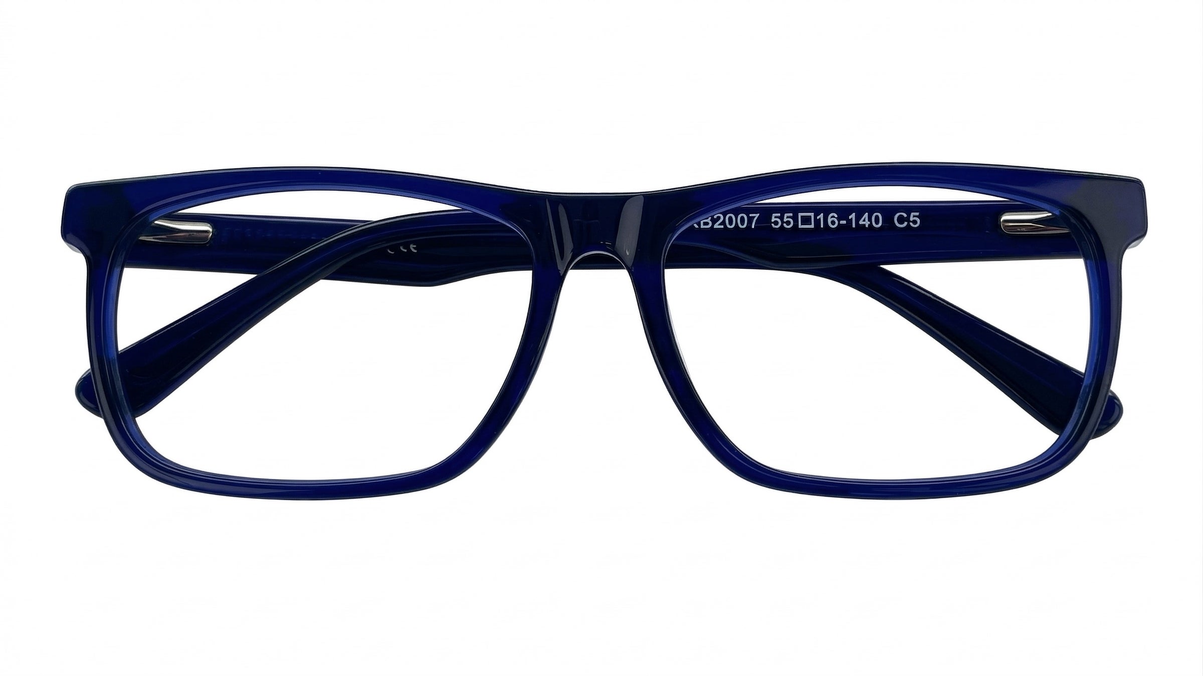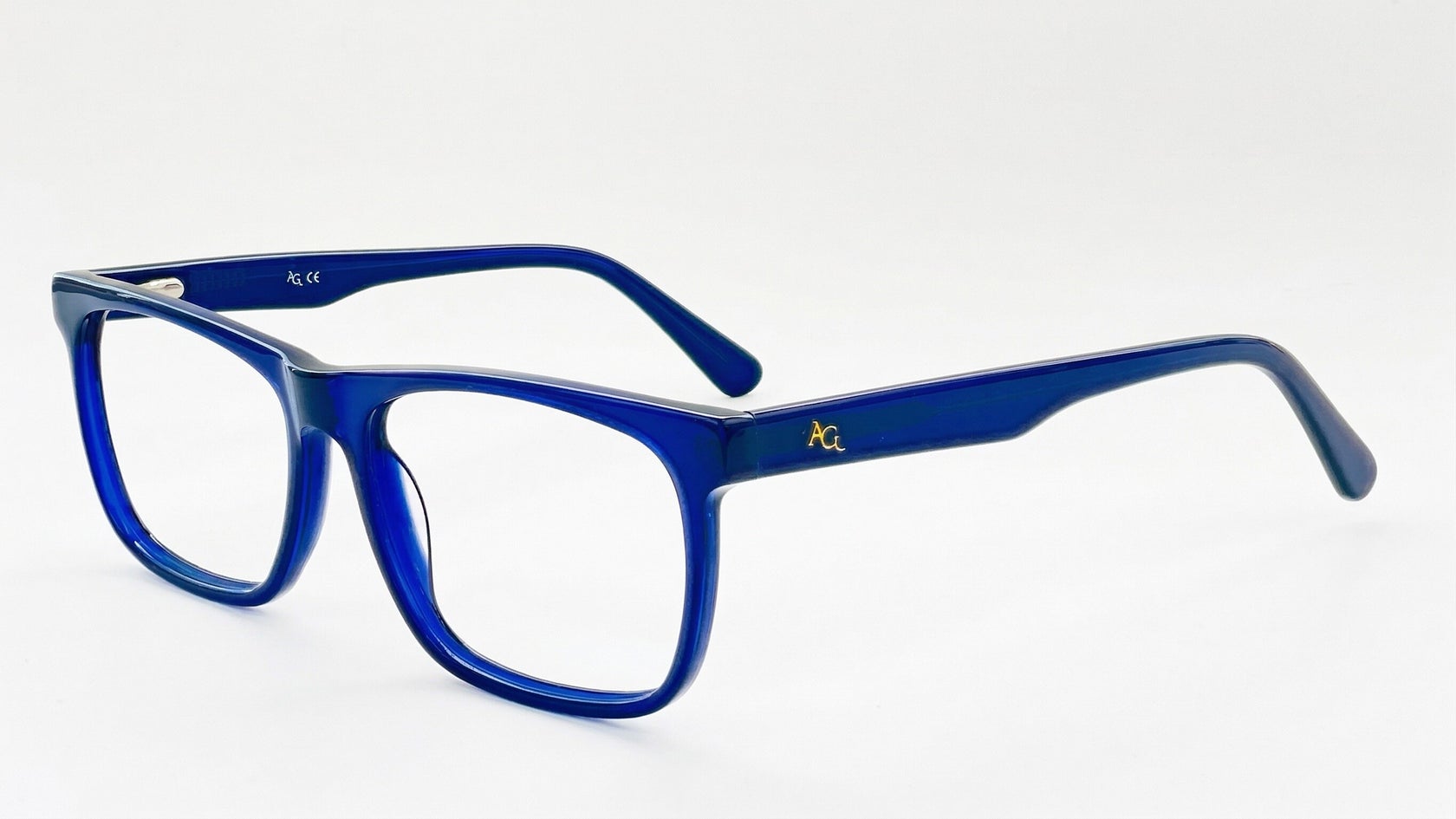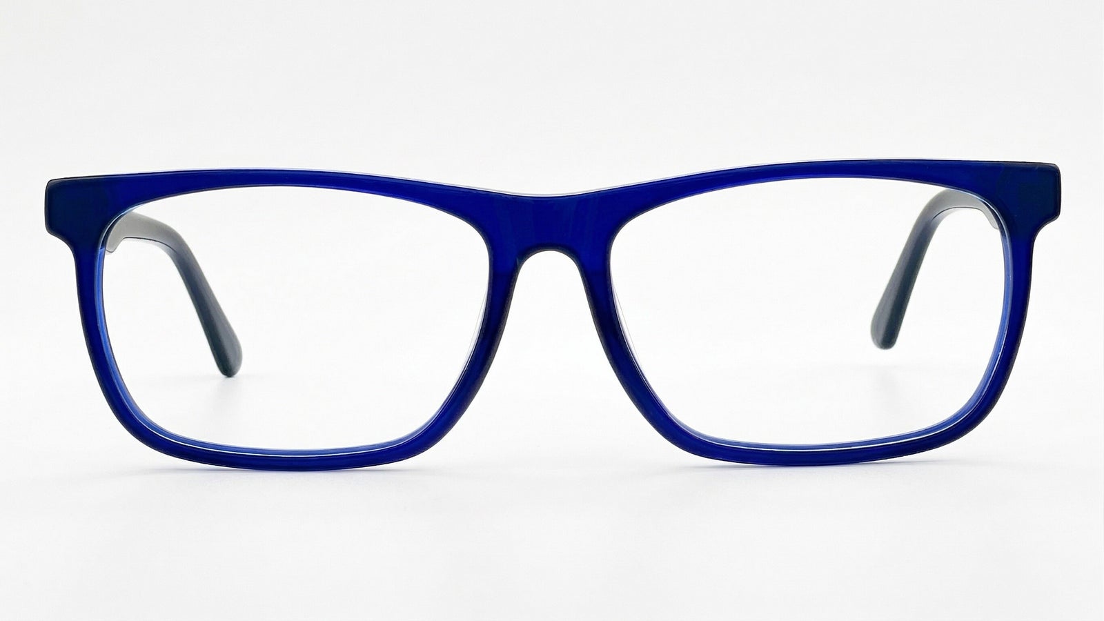 Montura masculina azul oscuro translúcido, de forma rectangular, tamaño ancho, elaborada en acetato, con puente anatómico, frente estilizado y diseño moderno, ideal para un look sobrio y versátil.