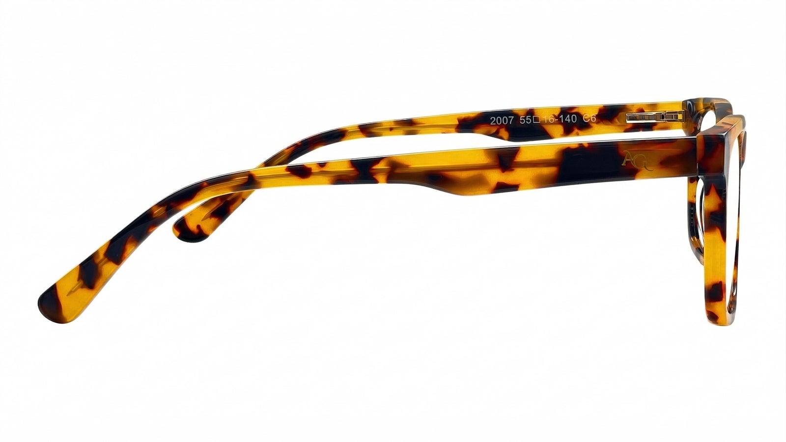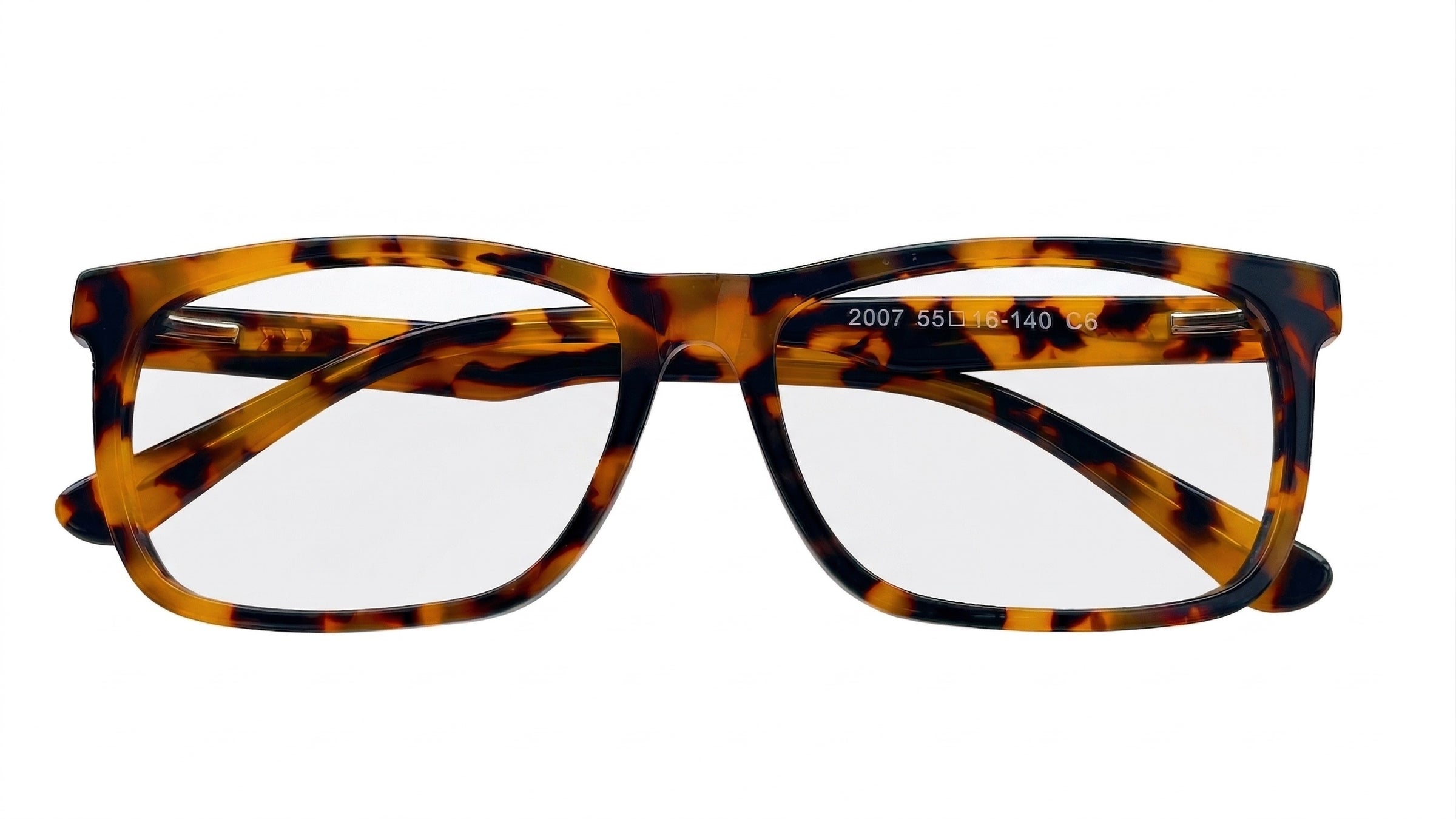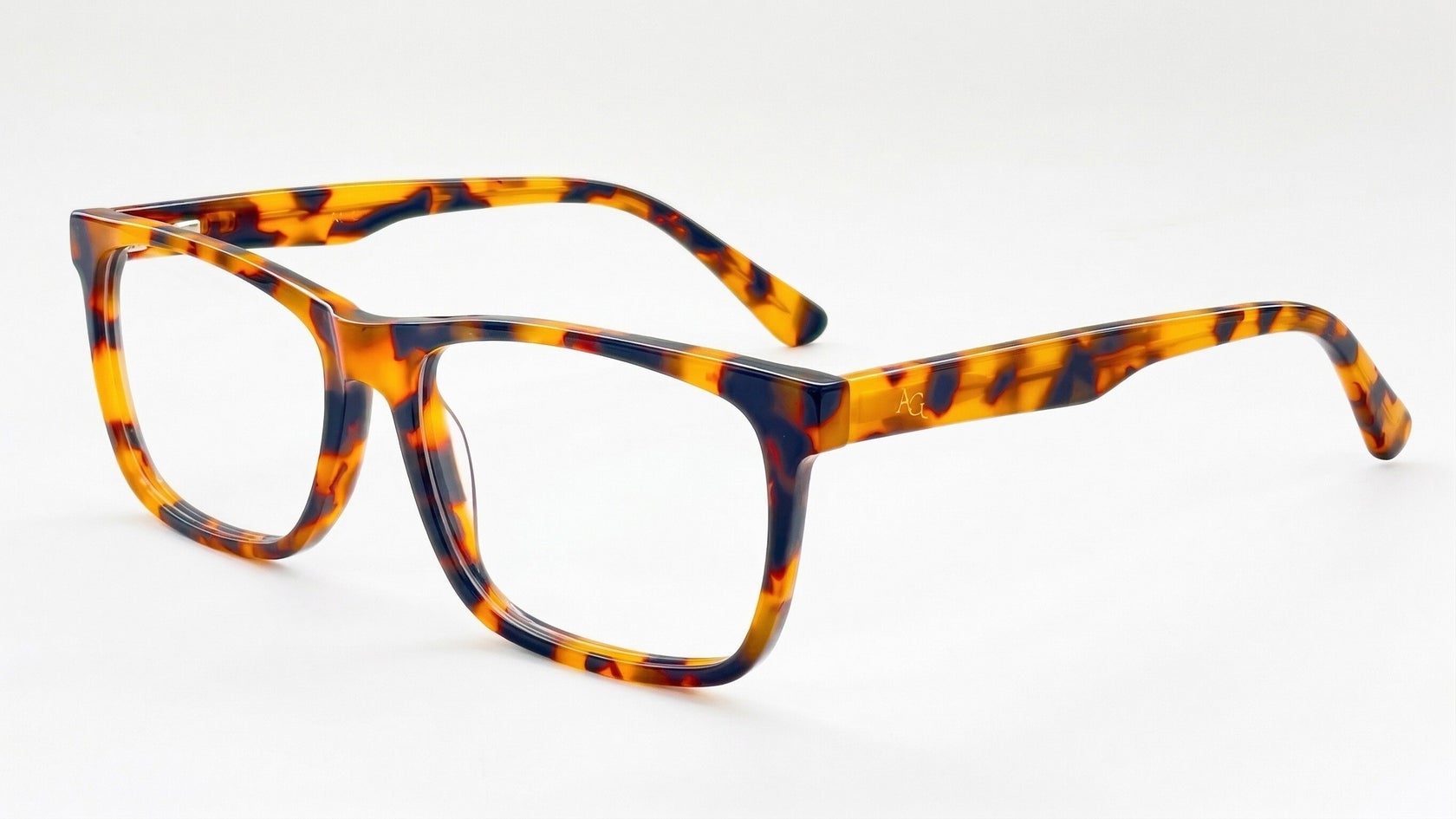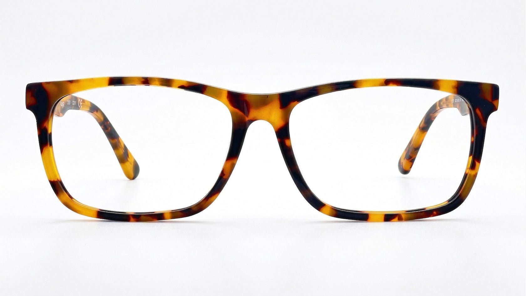 Montura masculina carey translúcido, de forma rectangular, tamaño ancho, elaborada en acetato, con puente anatómico, frente estilizado y diseño moderno, ideal para un look sobrio y versátil.
