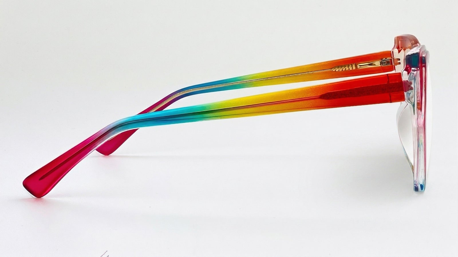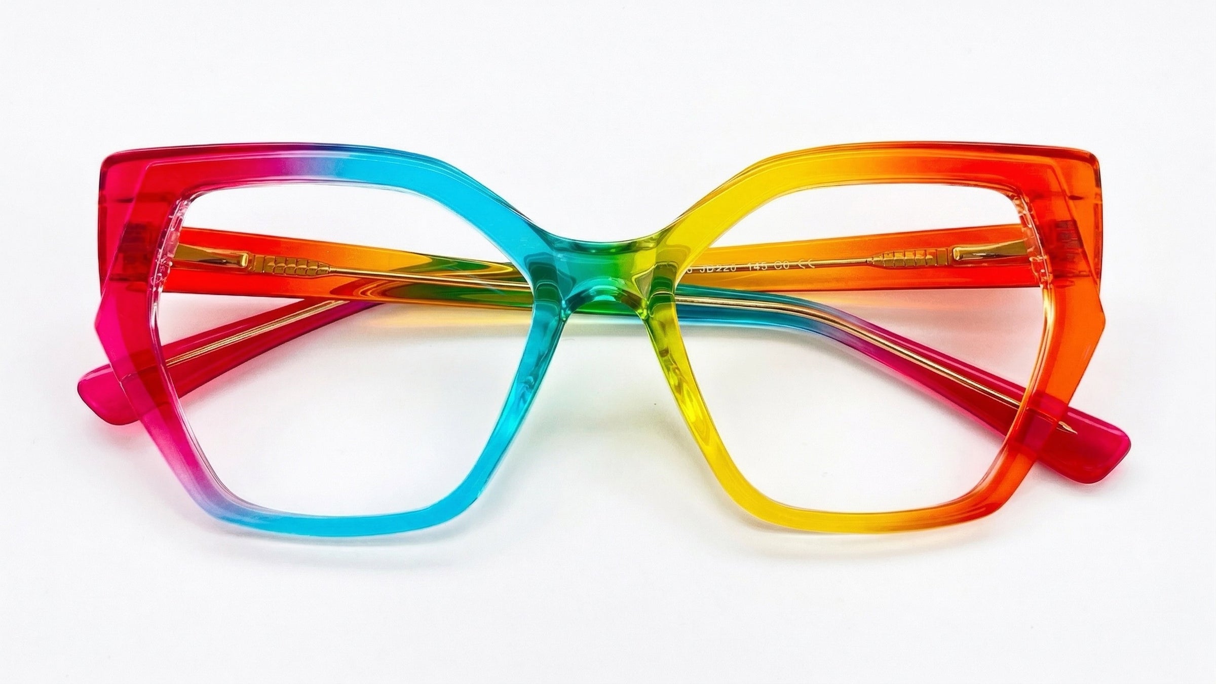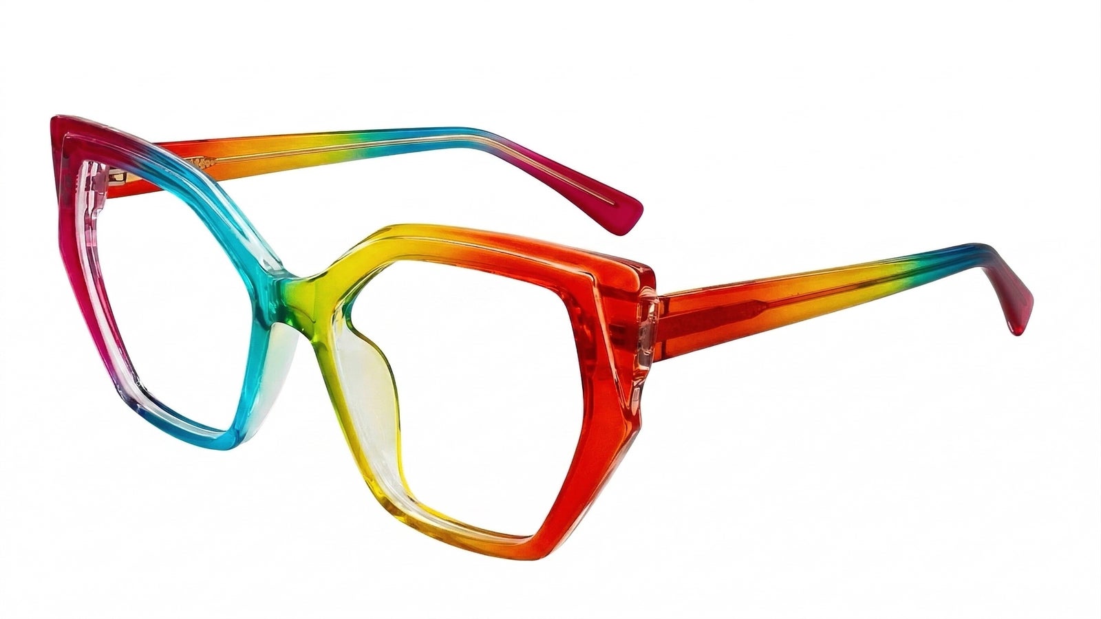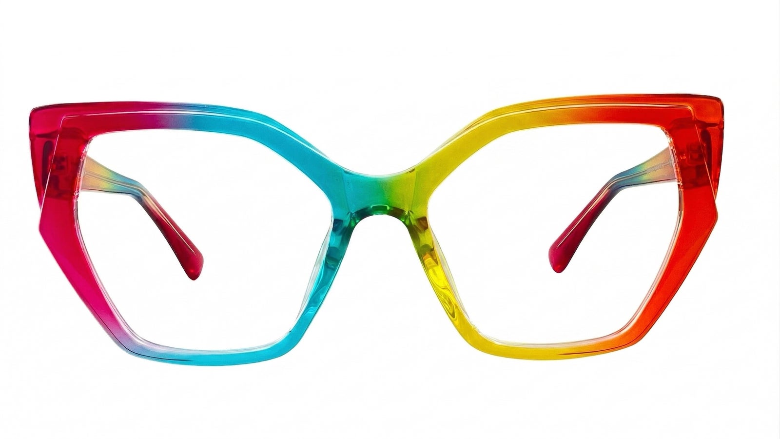 Montura femenina multicolor translúcida en arcoíris, de forma geométrica oversize, tamaño ancho, elaborada en TR90, con puente anatómico y diseño vibrante en tonos fucsia, azul, verde, amarillo y naranja, ideal para un look alegre, moderno y lleno de pers