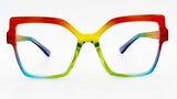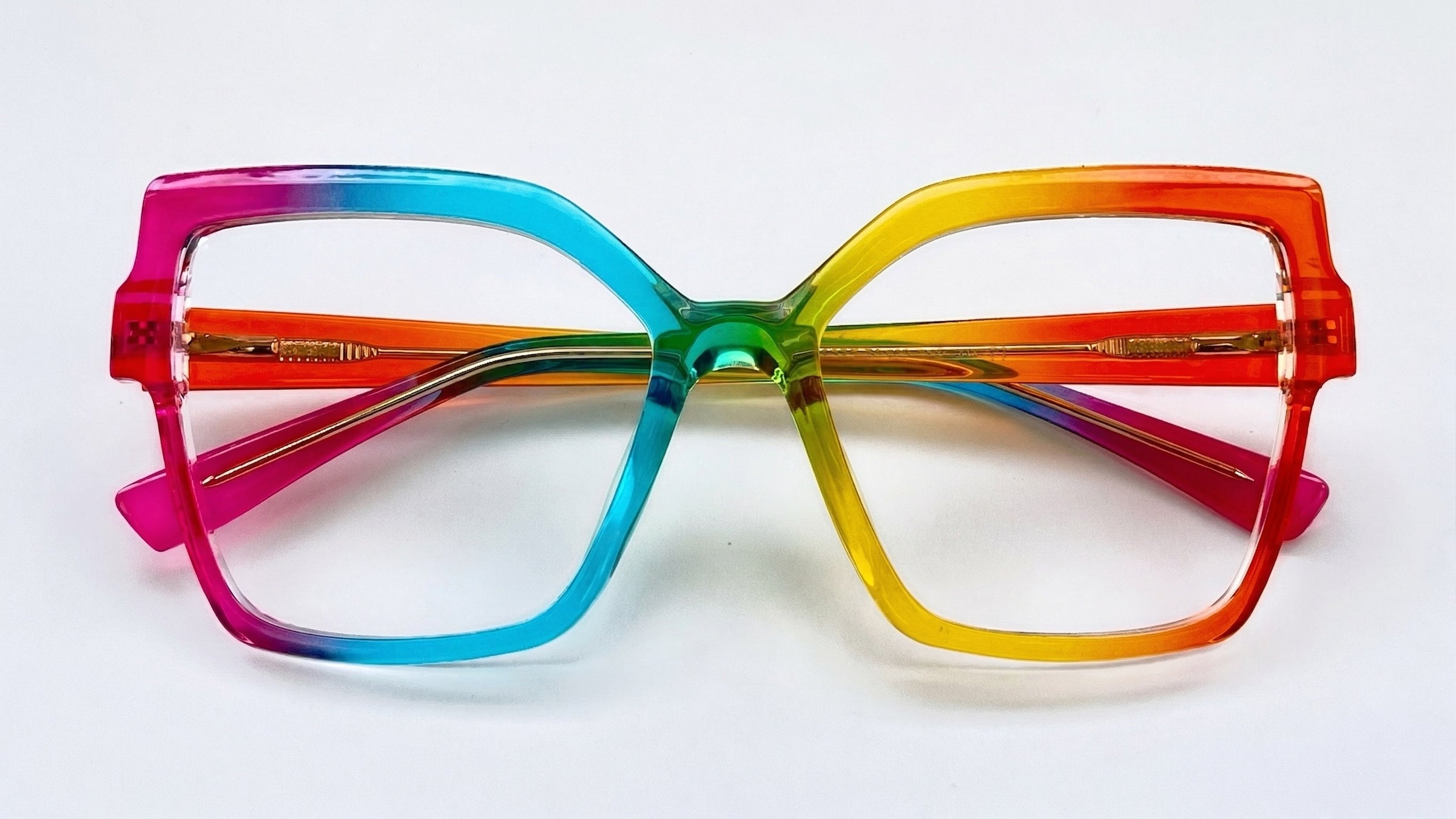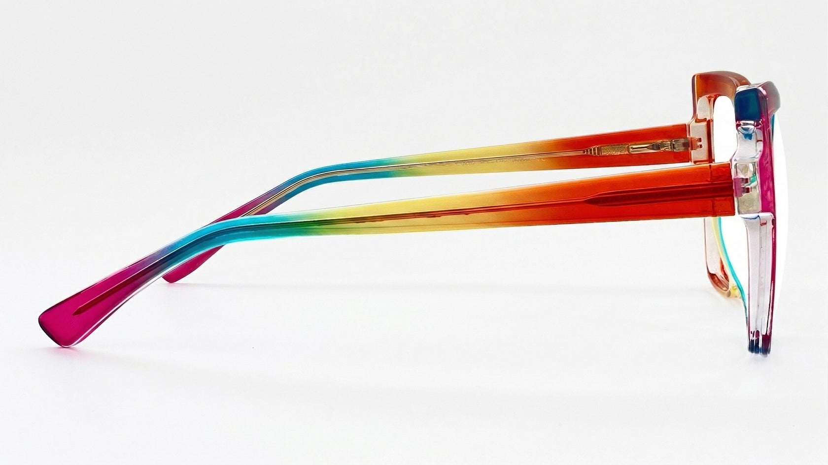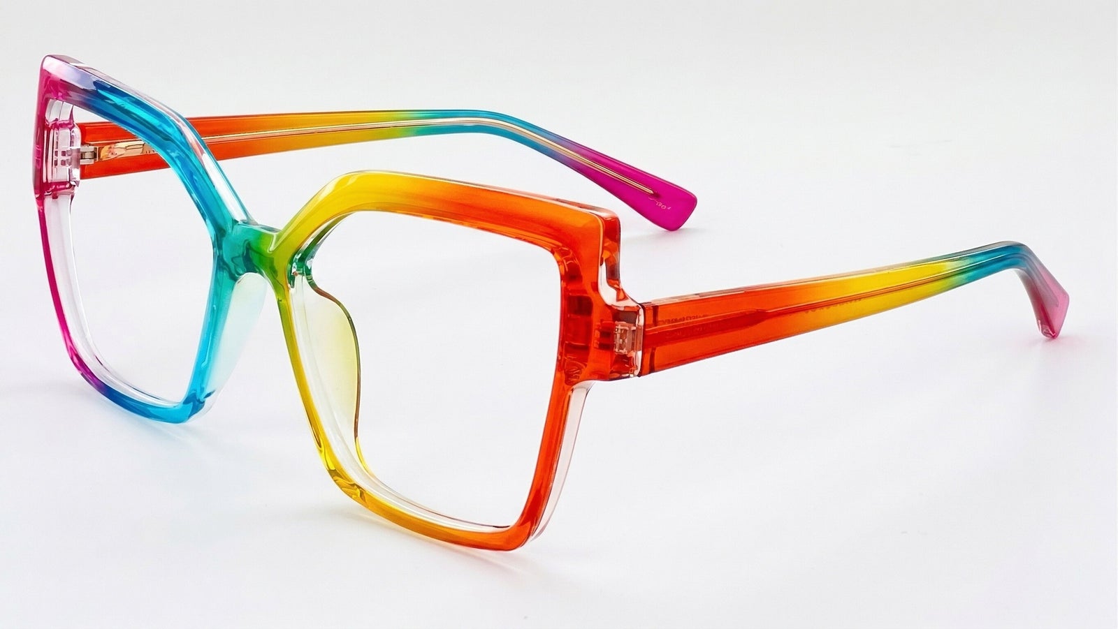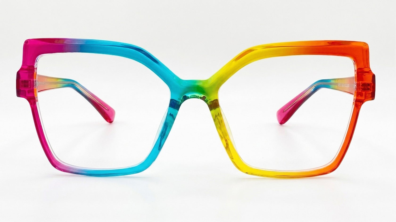 Montura oversize de 5 lados semiagatada en TR-90 ultraligero, con acabado transparente y degradado multicolor tipo arcoíris en rosa, azul, verde, amarillo y naranja. Cuenta con puente anatómico y bisagra flex para un calce cómodo.