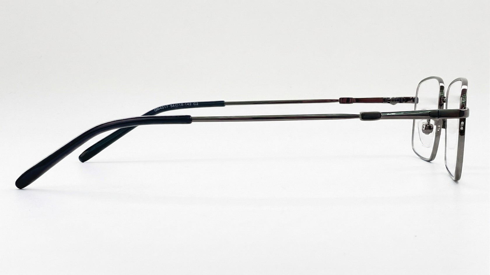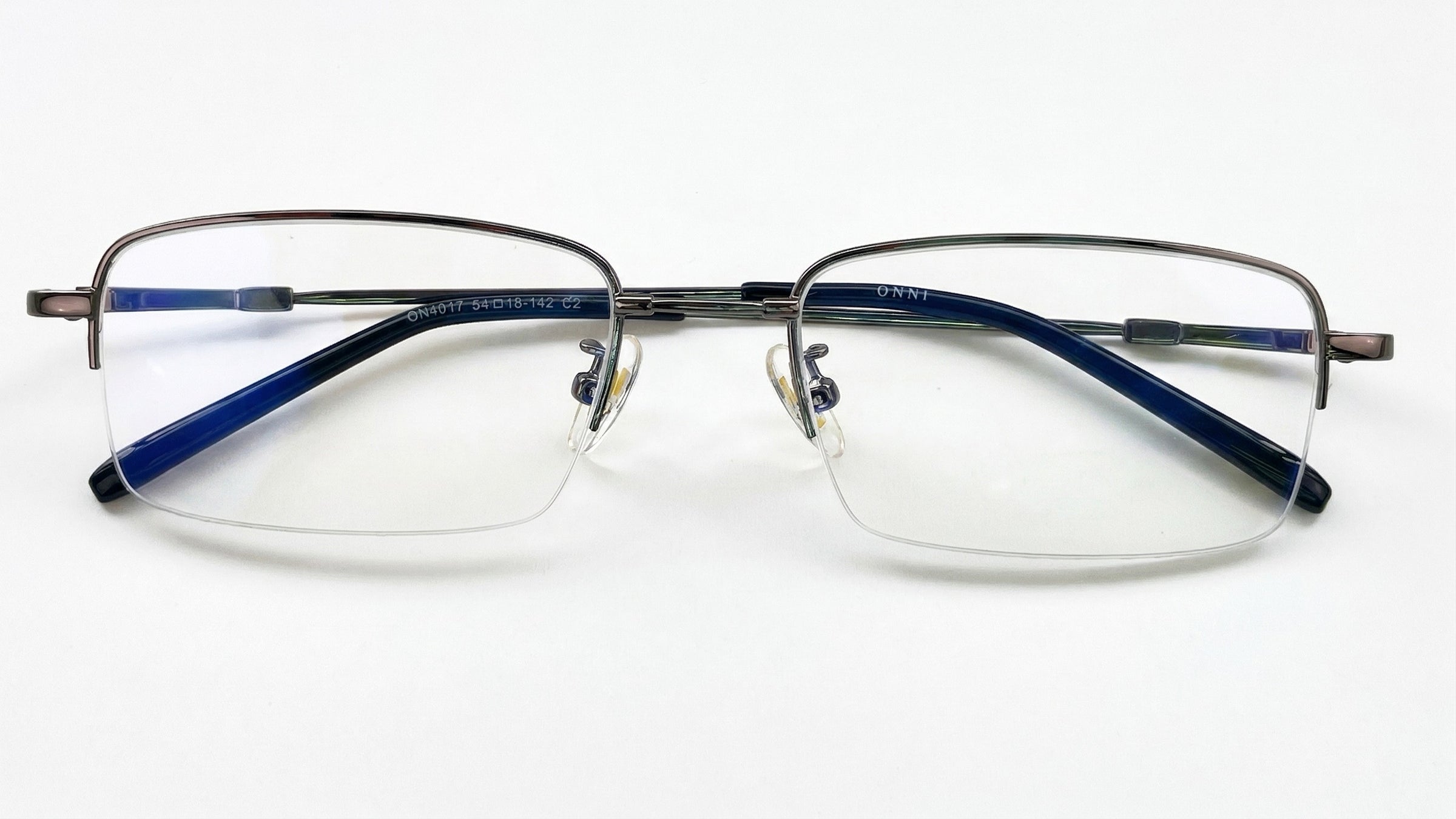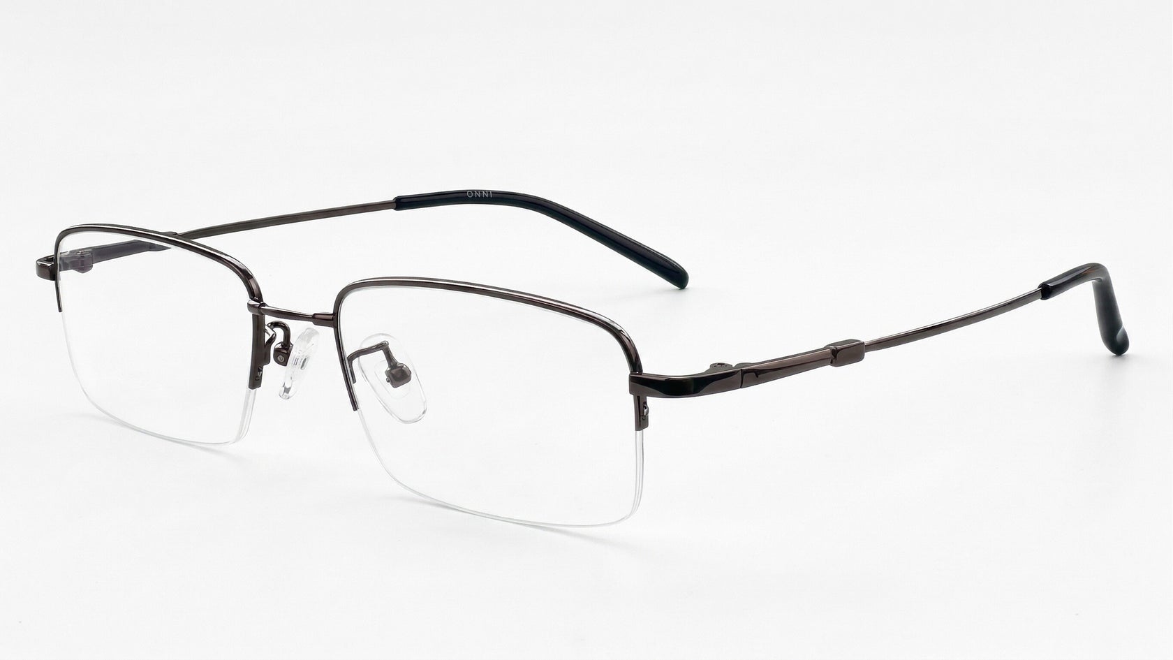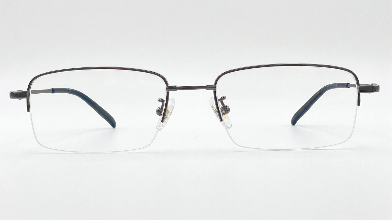 Gafas de media montura en color titanio, livianas y discretas, con plaquetas ajustables y terminales negras para un ajuste cómodo.