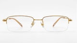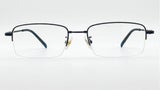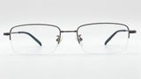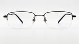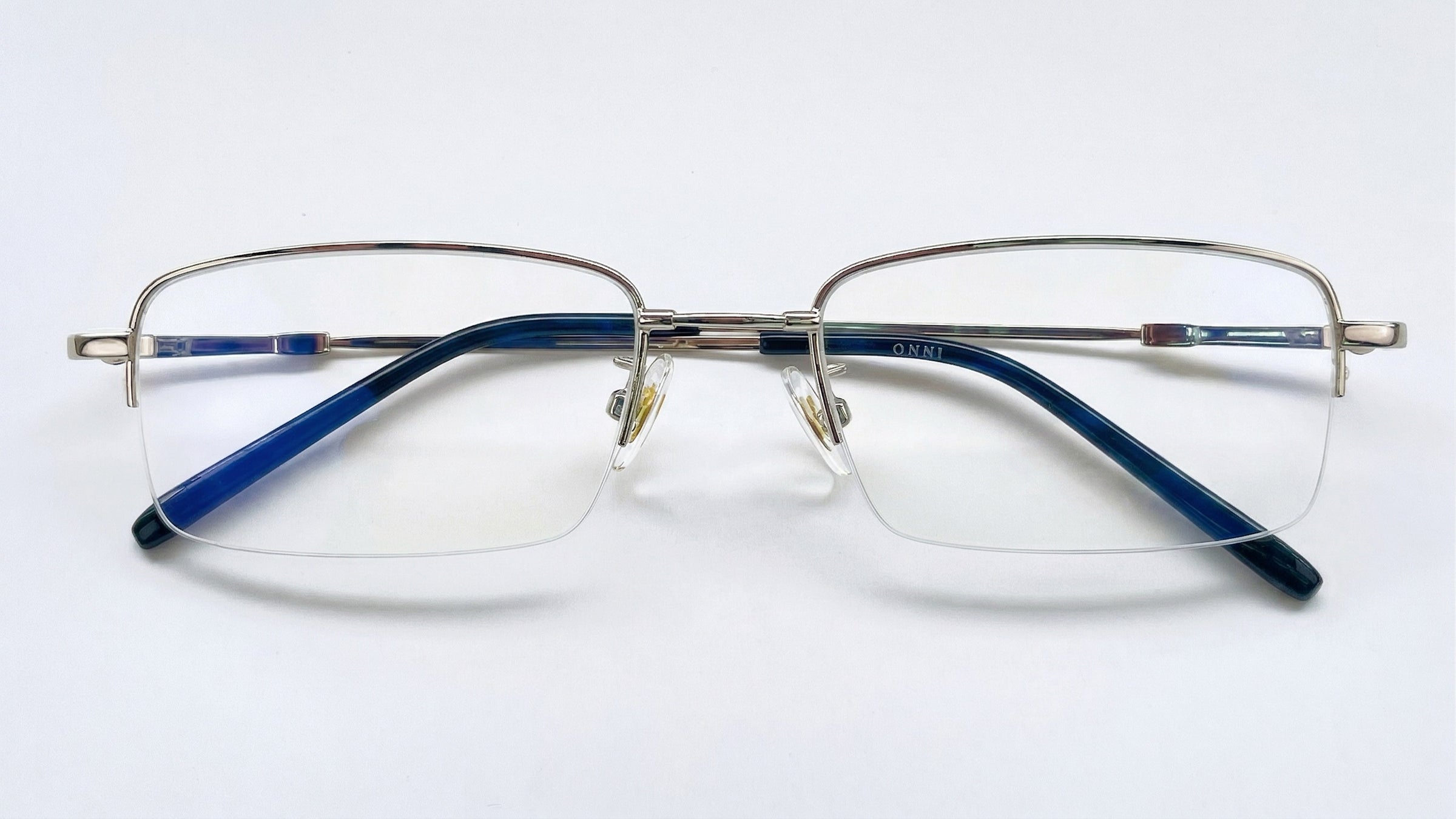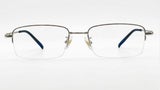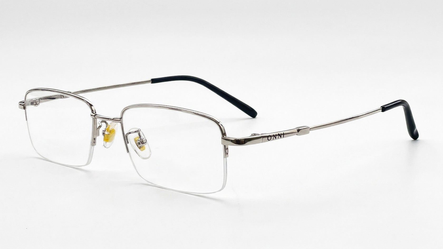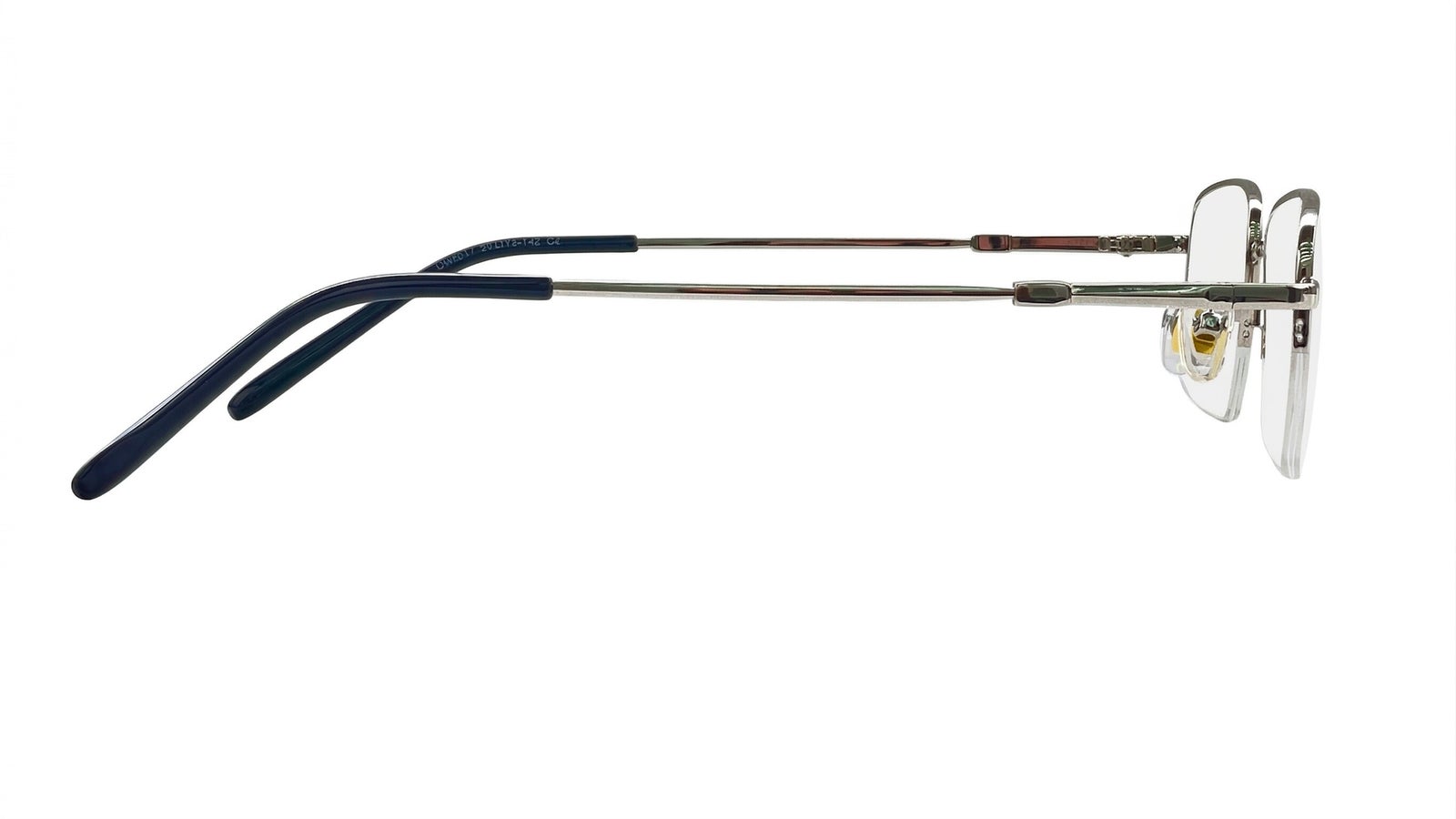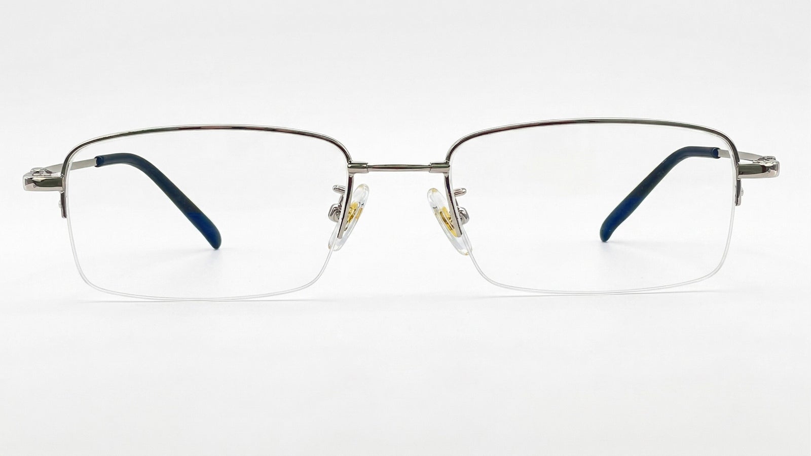 Gafas de media montura en plata, livianas y discretas, con plaquetas ajustables y terminales negras para un ajuste cómodo.