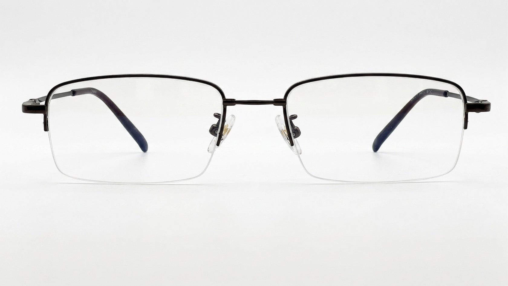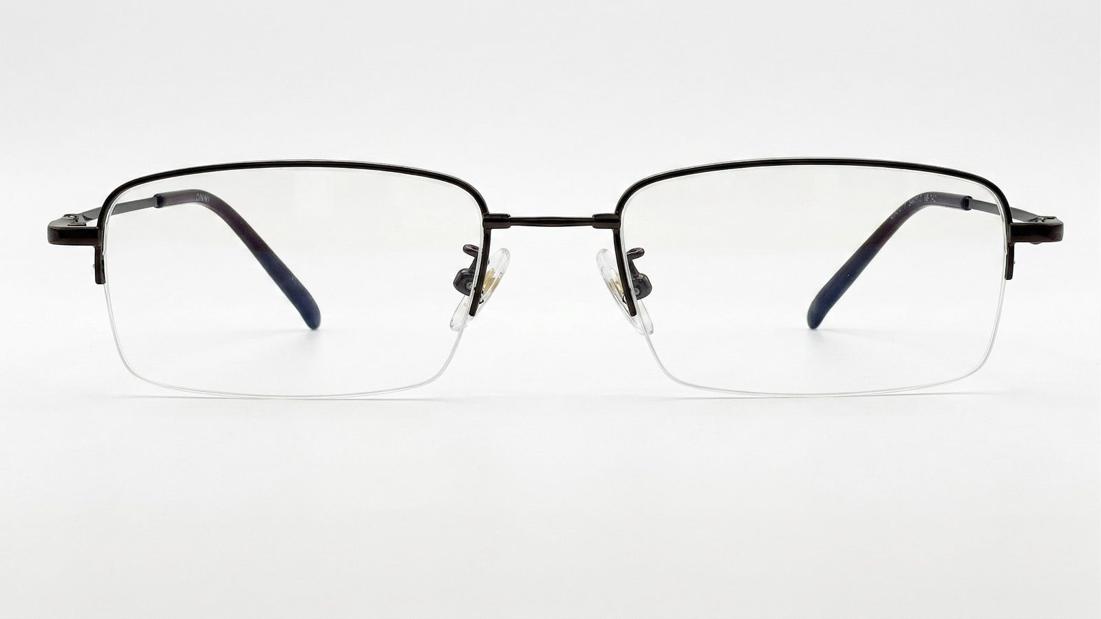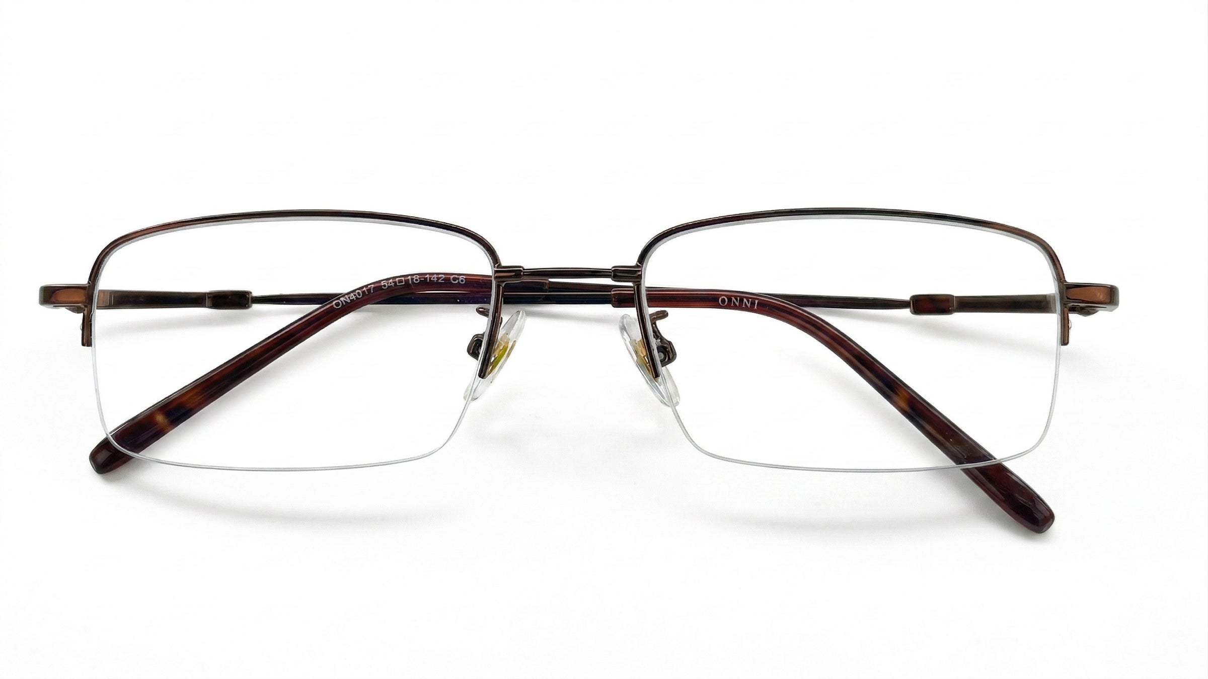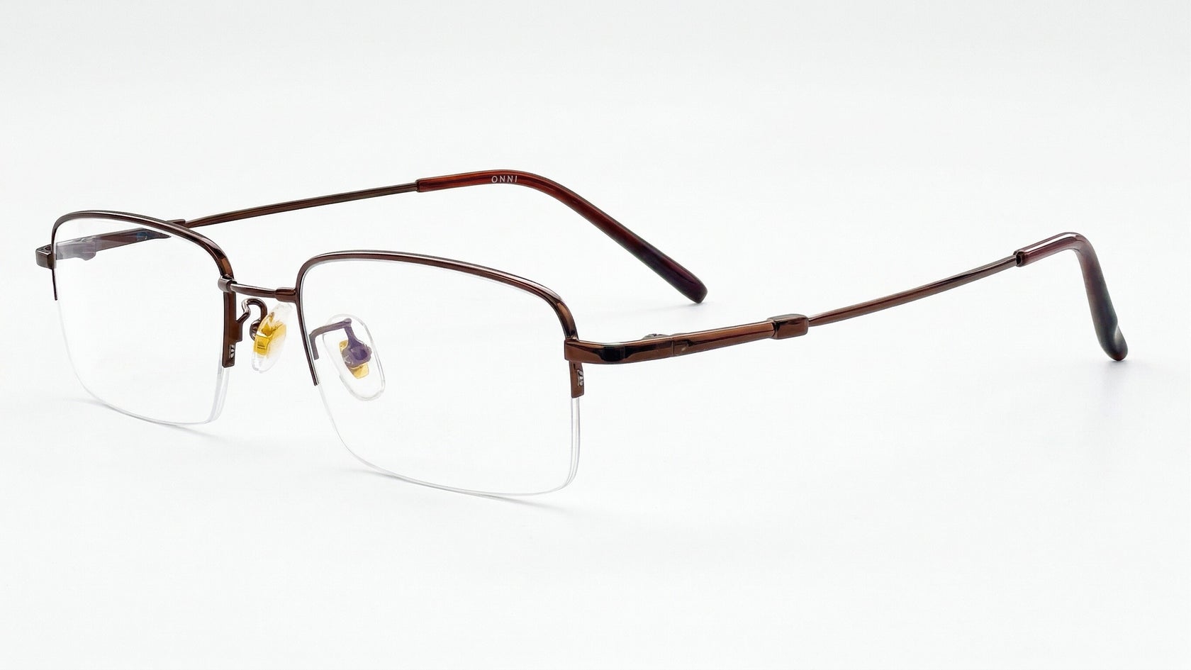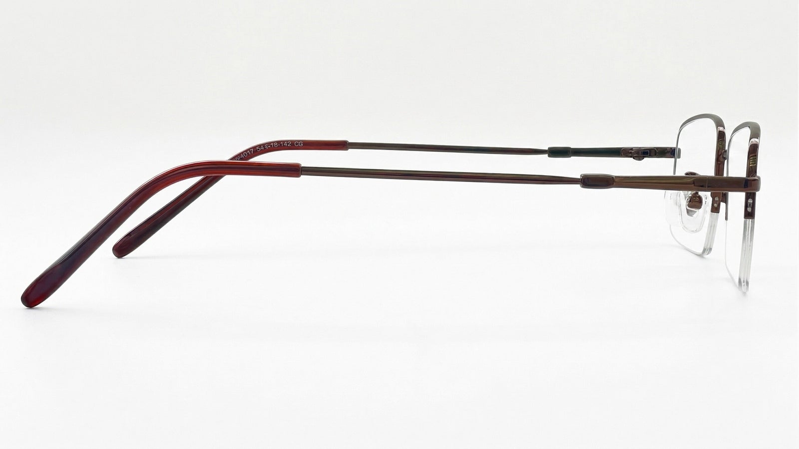 Gafas de media montura en vinotinto, livianas y discretas, con plaquetas ajustables y terminales vinotinto para un ajuste cómodo.