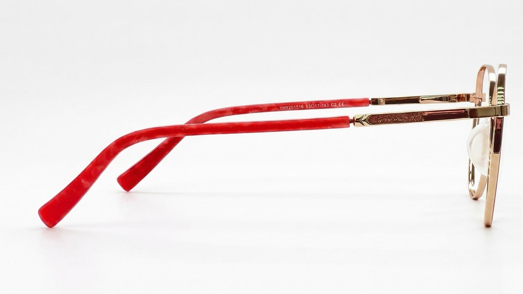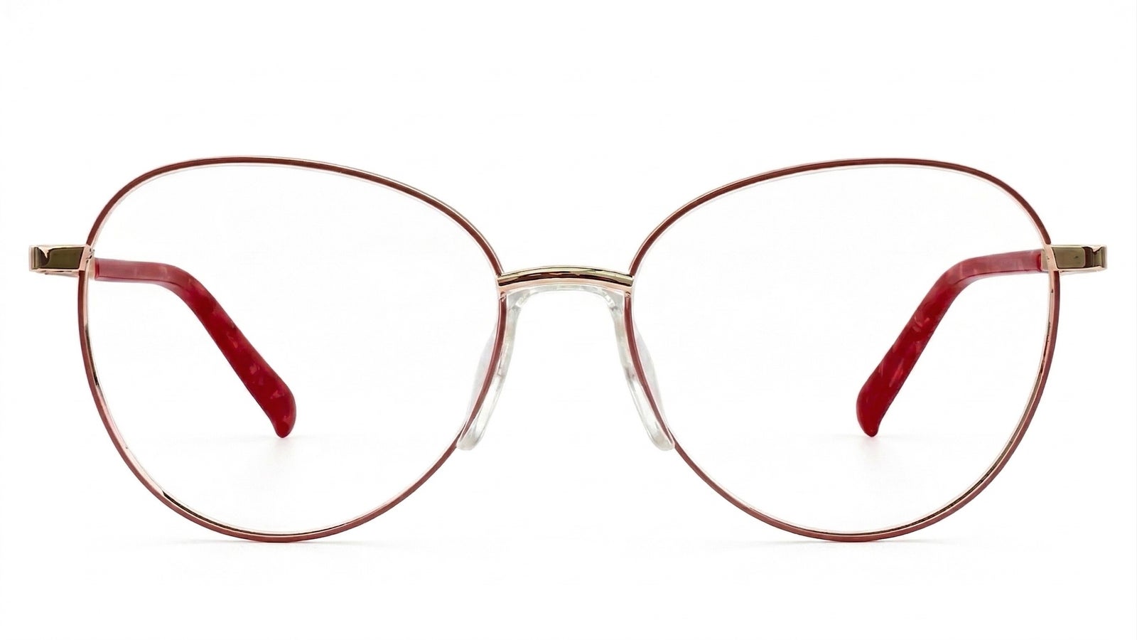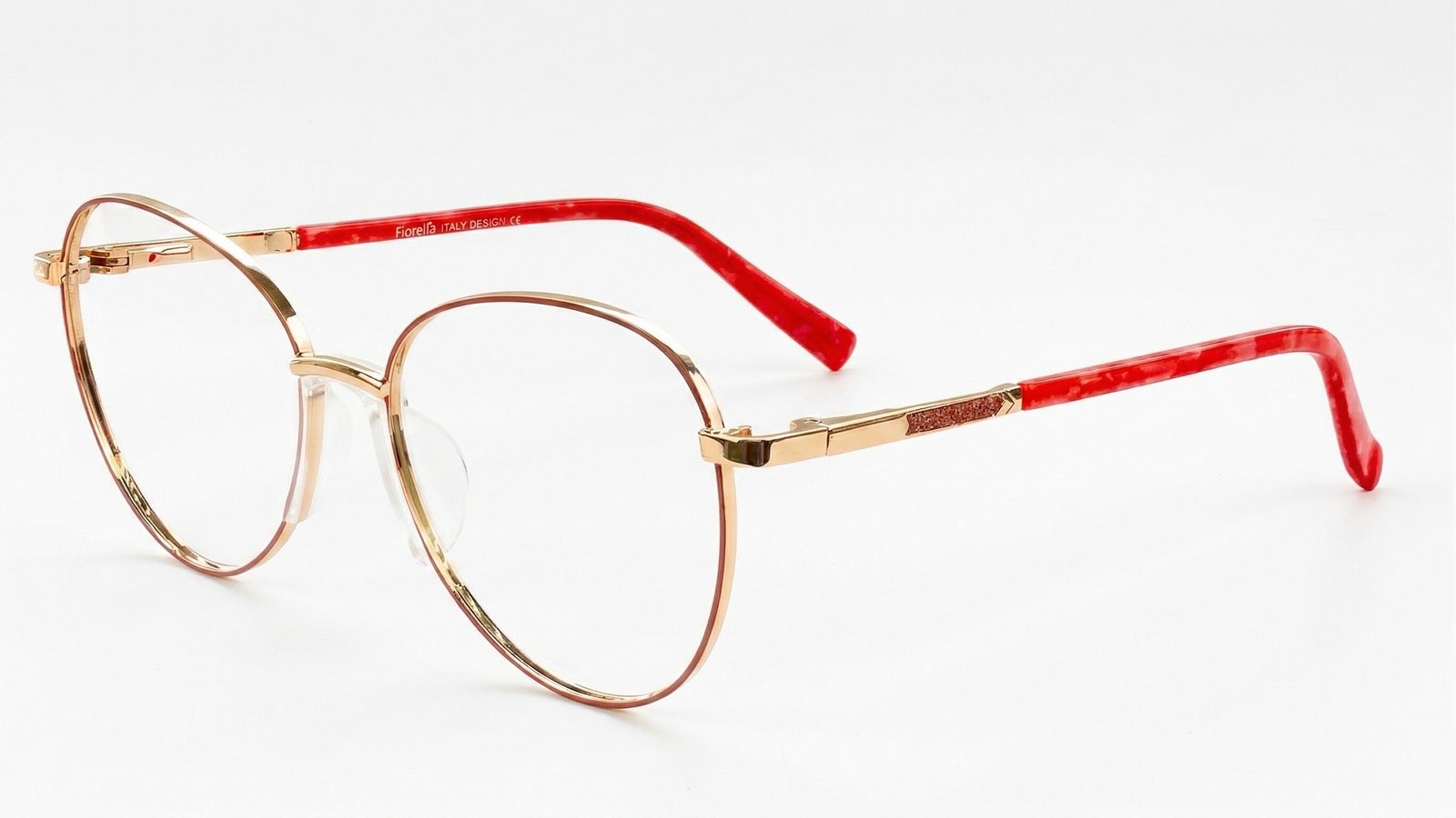 Combinación delicada en dorado, nude translúcido y rojo brillante, con aro fino de acabado suave, brazos metálicos con escarcha sutil y terminales rojas que le dan un toque femenino y llamativo.