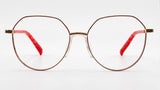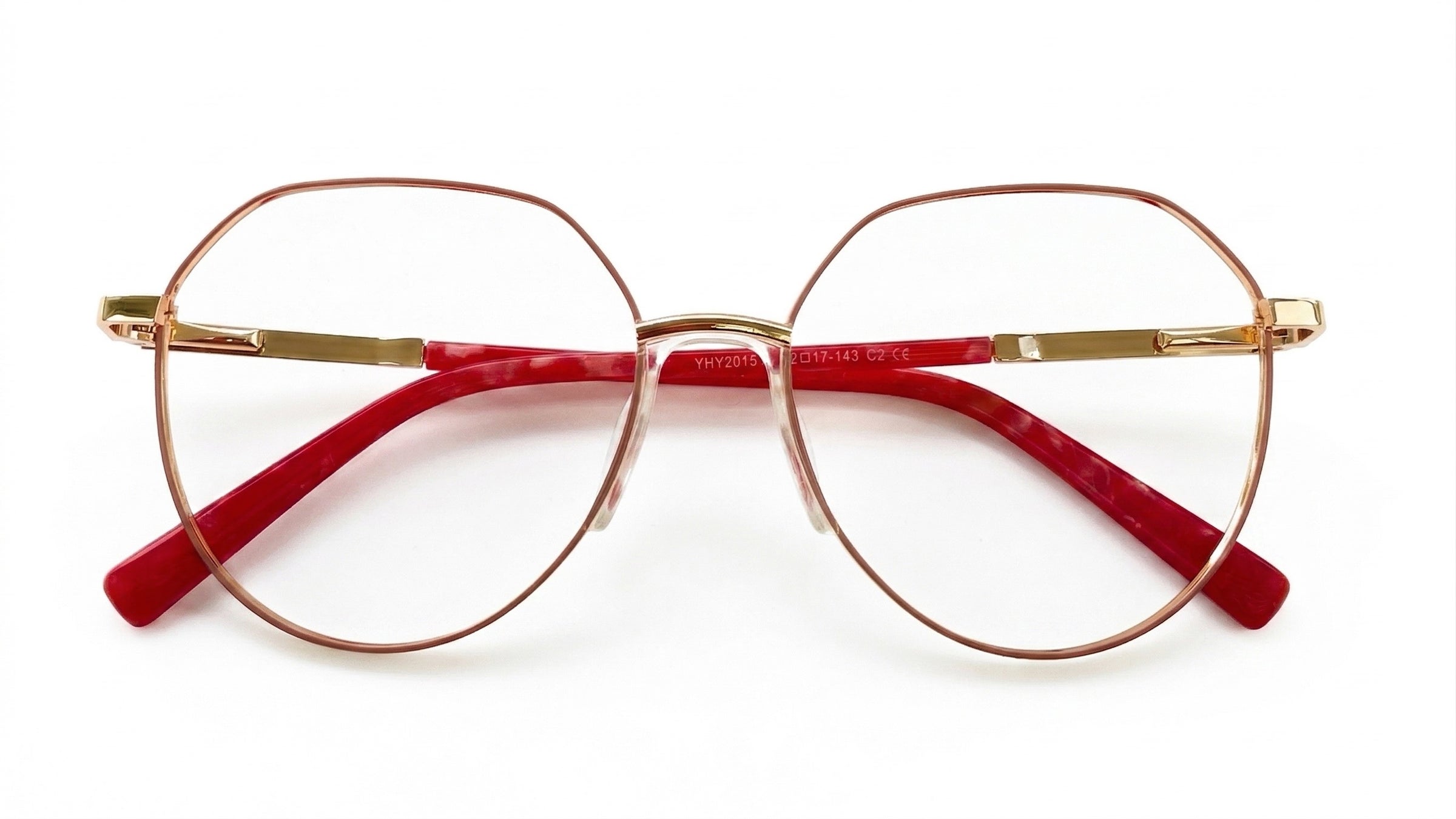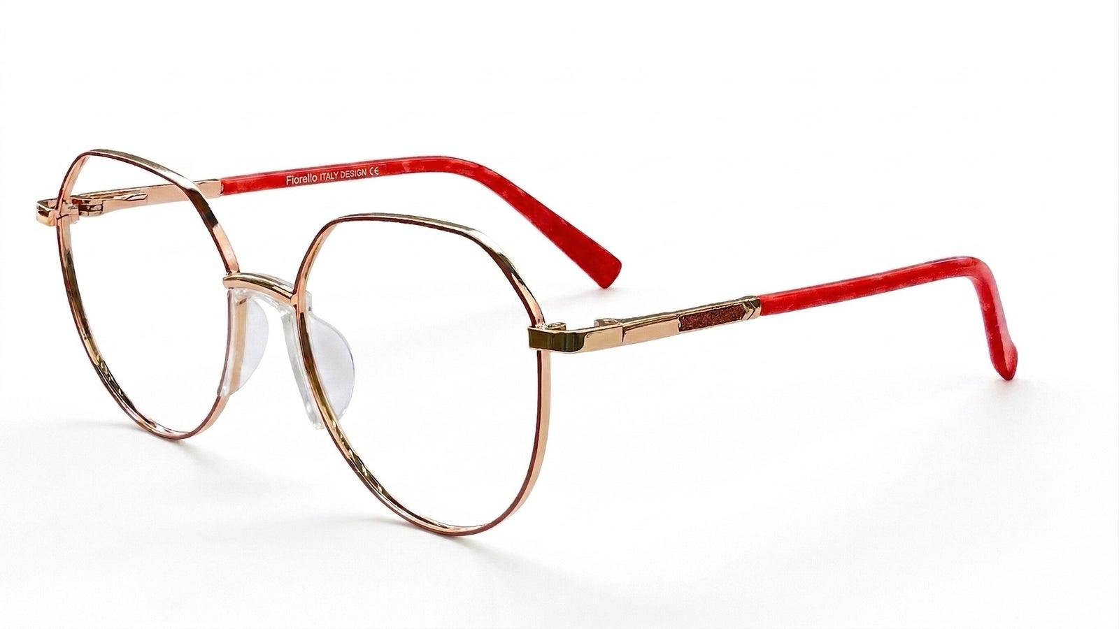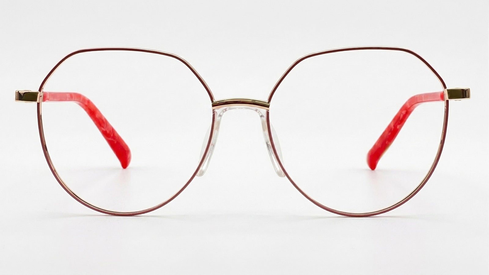 Combinación llamativa en oro rosa, nude y rojo brillante, con aro fino de acabado cálido, brazos rojos con escarcha sutil y terminales rojas de brillo intenso.