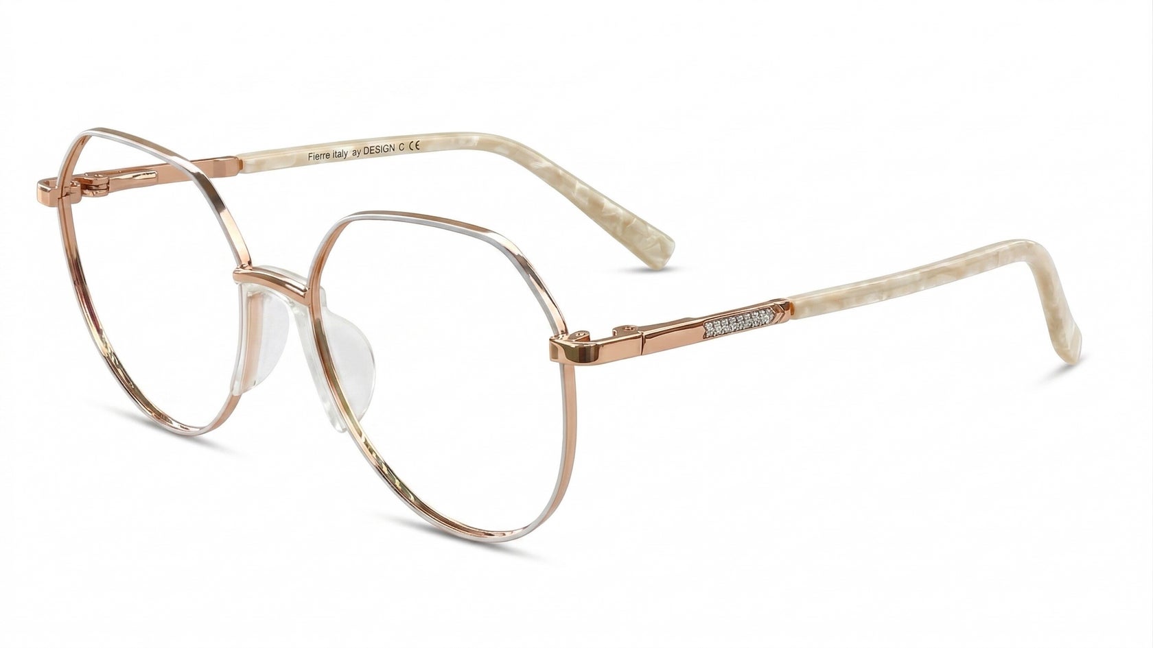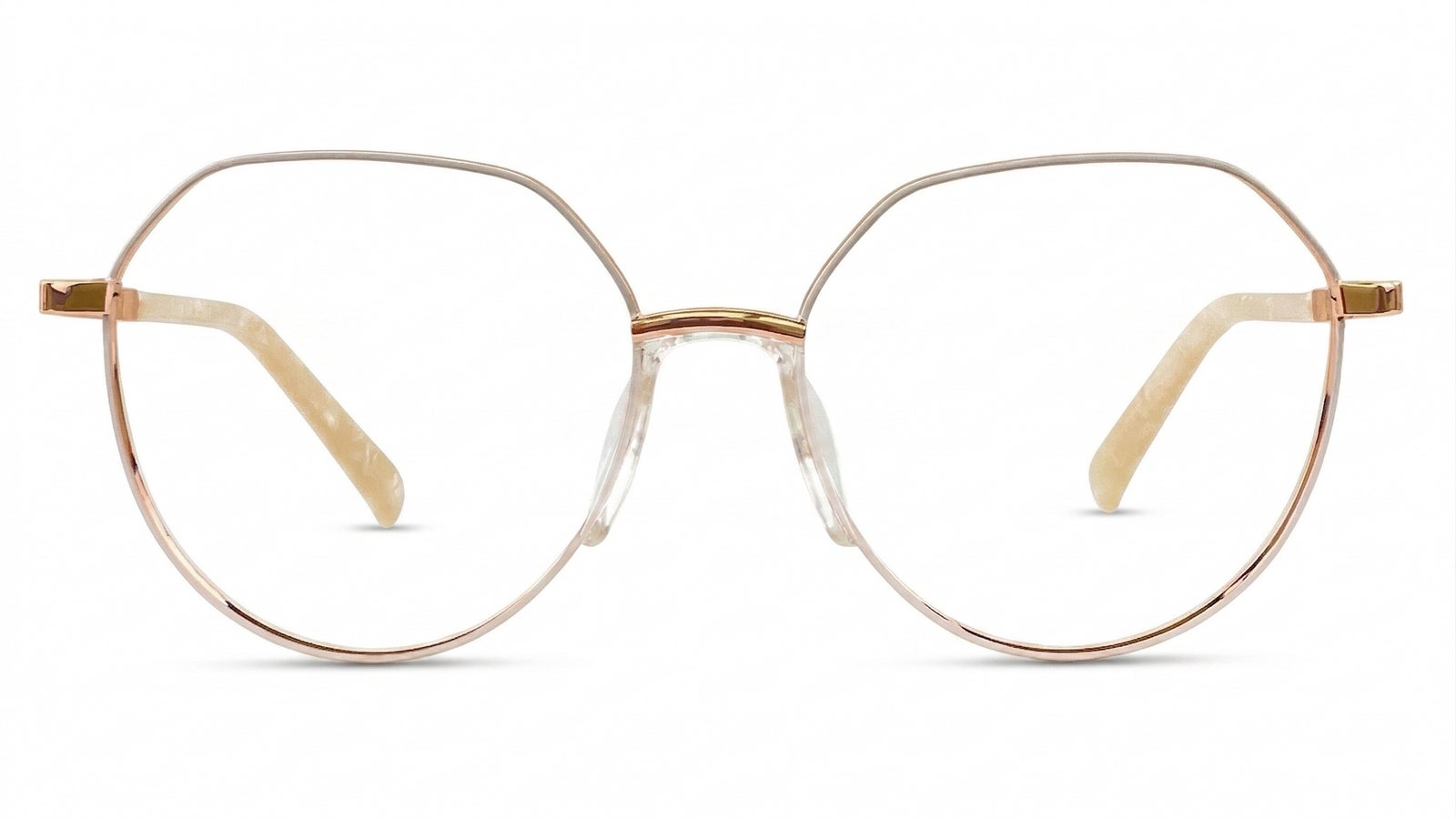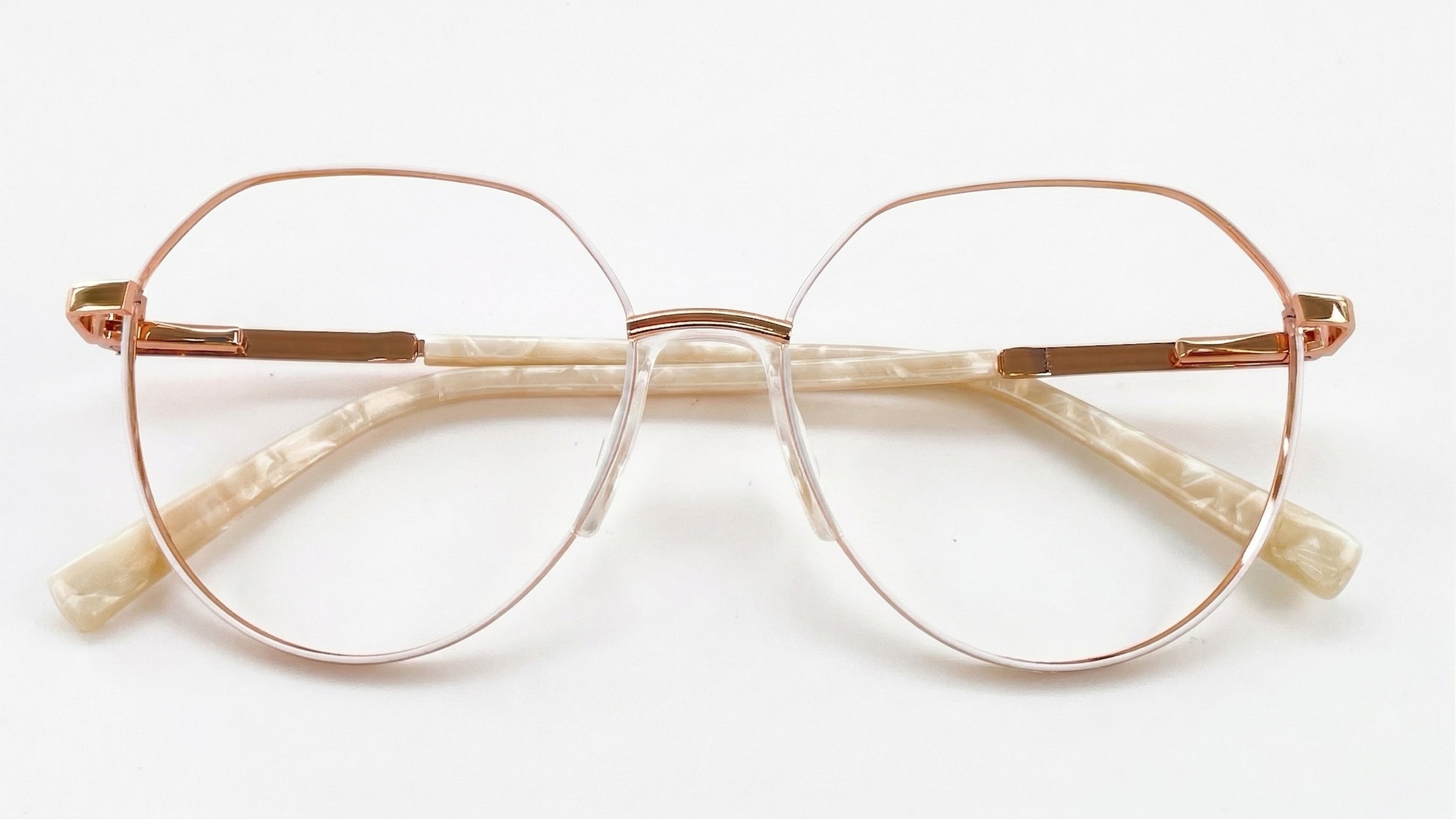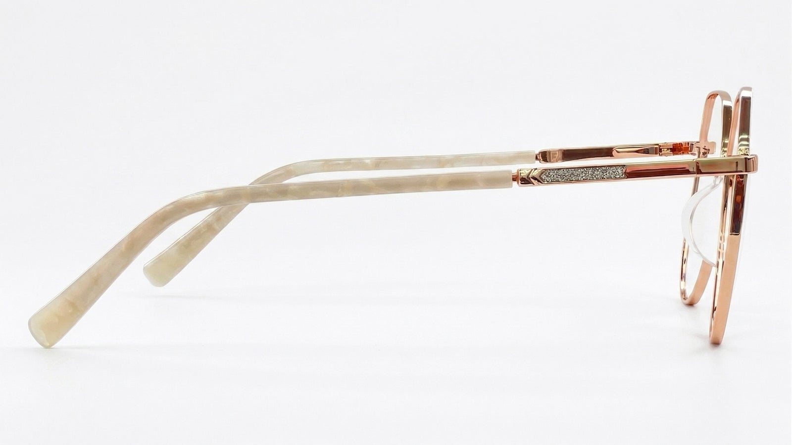 Combinación suave en oro rosa, nude y crema nacarada, con aro fino de brillo delicado, brazos de efecto marmolado claro y detalle de escarcha sutil en el costado.