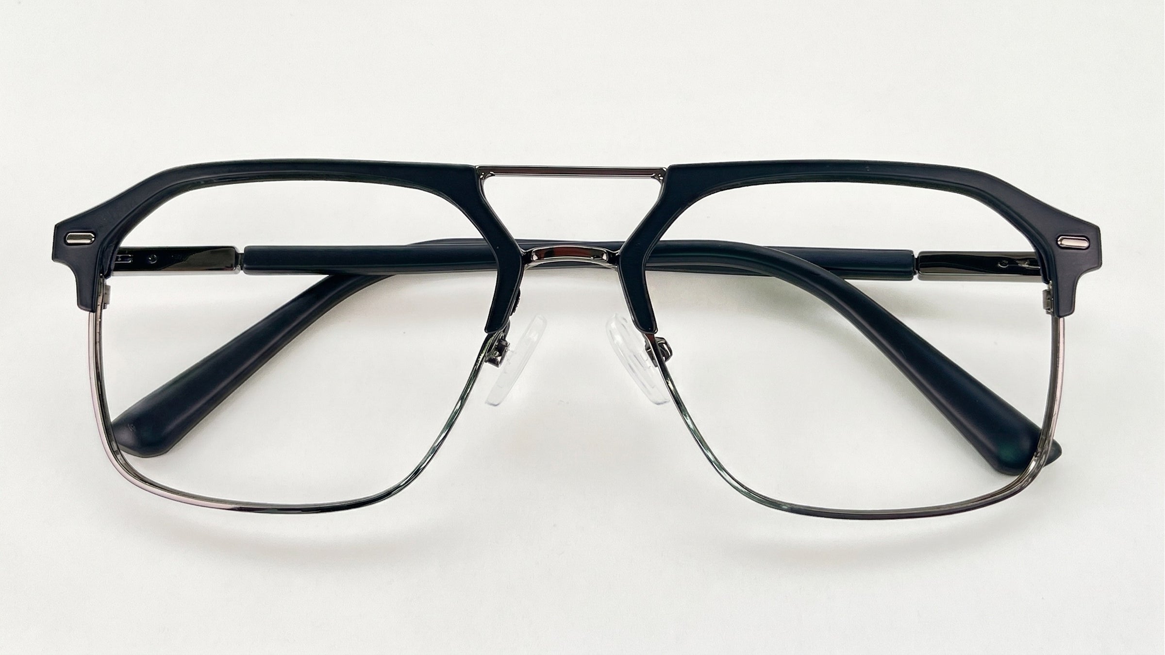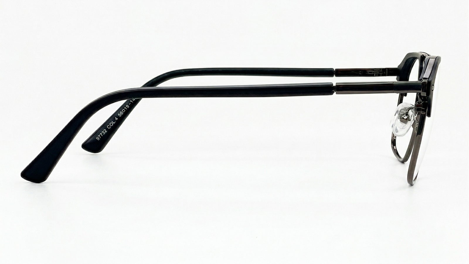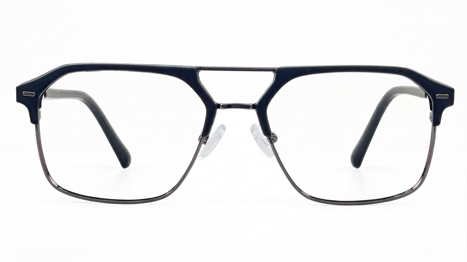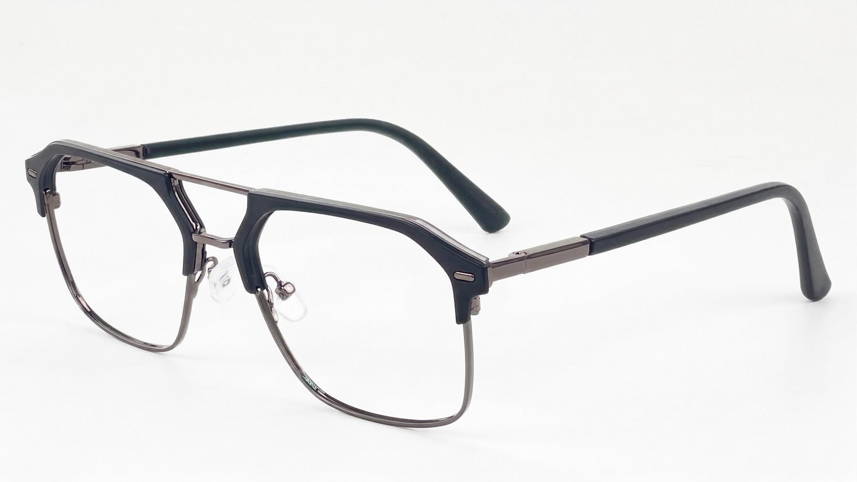 Negro grisáceo translúcido, frente rectangular de perfil delgado con doble puente, plaquetas ajustables y brazos oscuros que le dan un estilo sobrio, masculino y moderno.