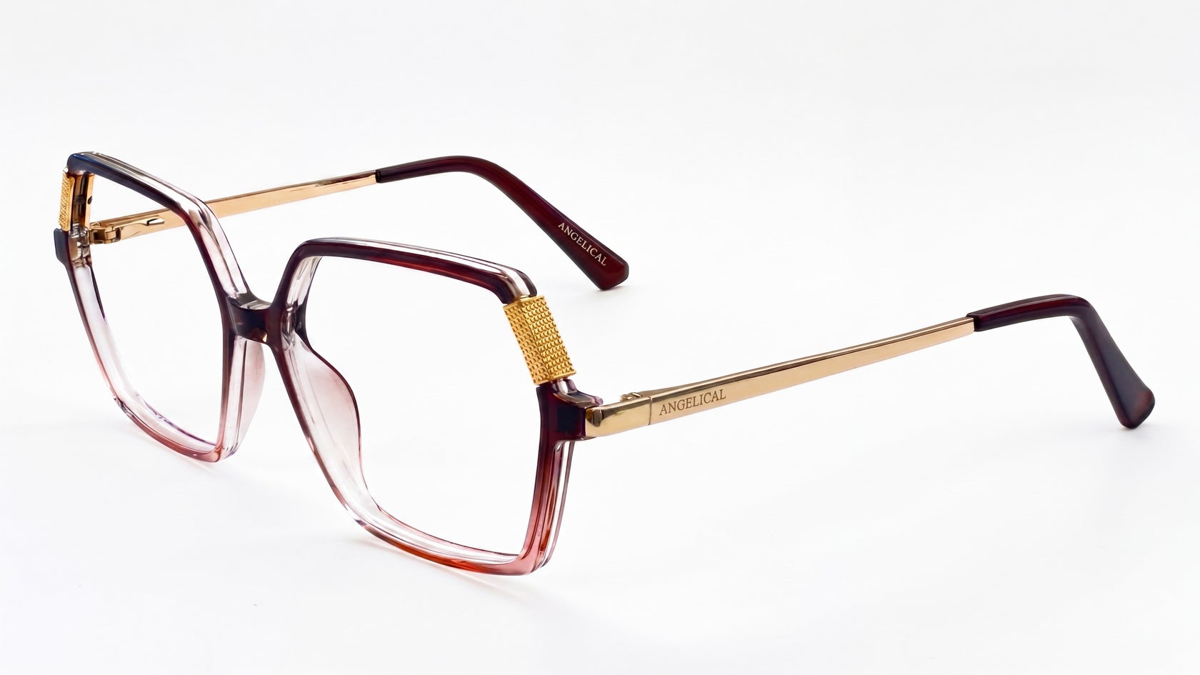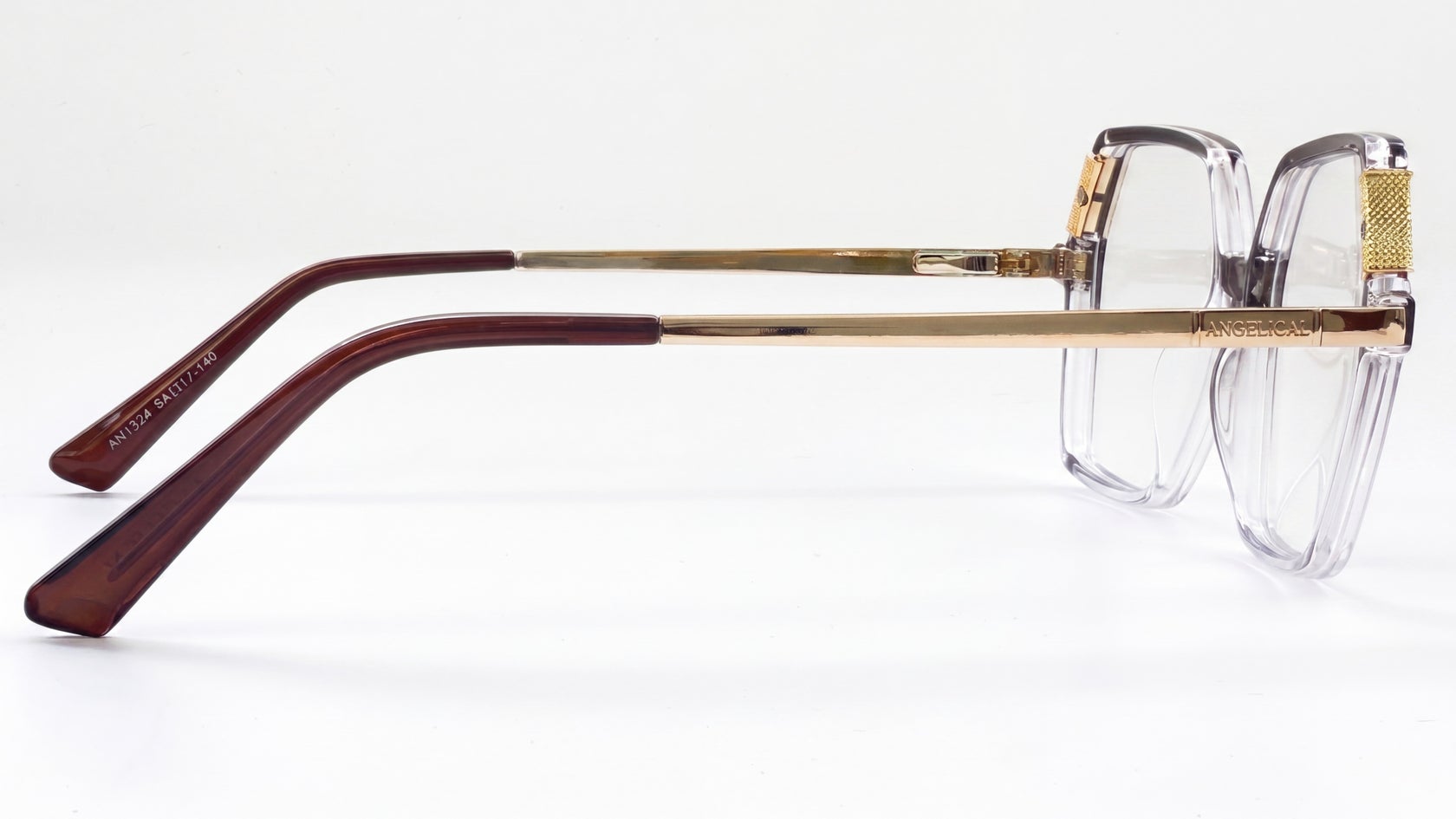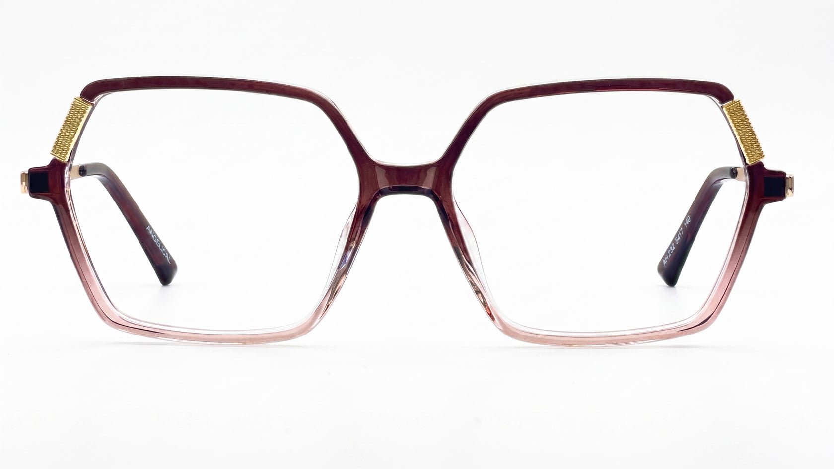 Palo rosa translúcido con dorado, de diseño elegante y femenino, con frente estilizado, detalle decorativo en los laterales y brazos delgados que le aportan un look sofisticado y delicado.