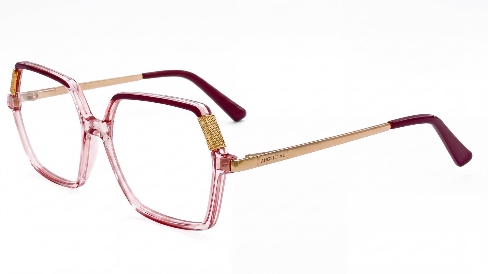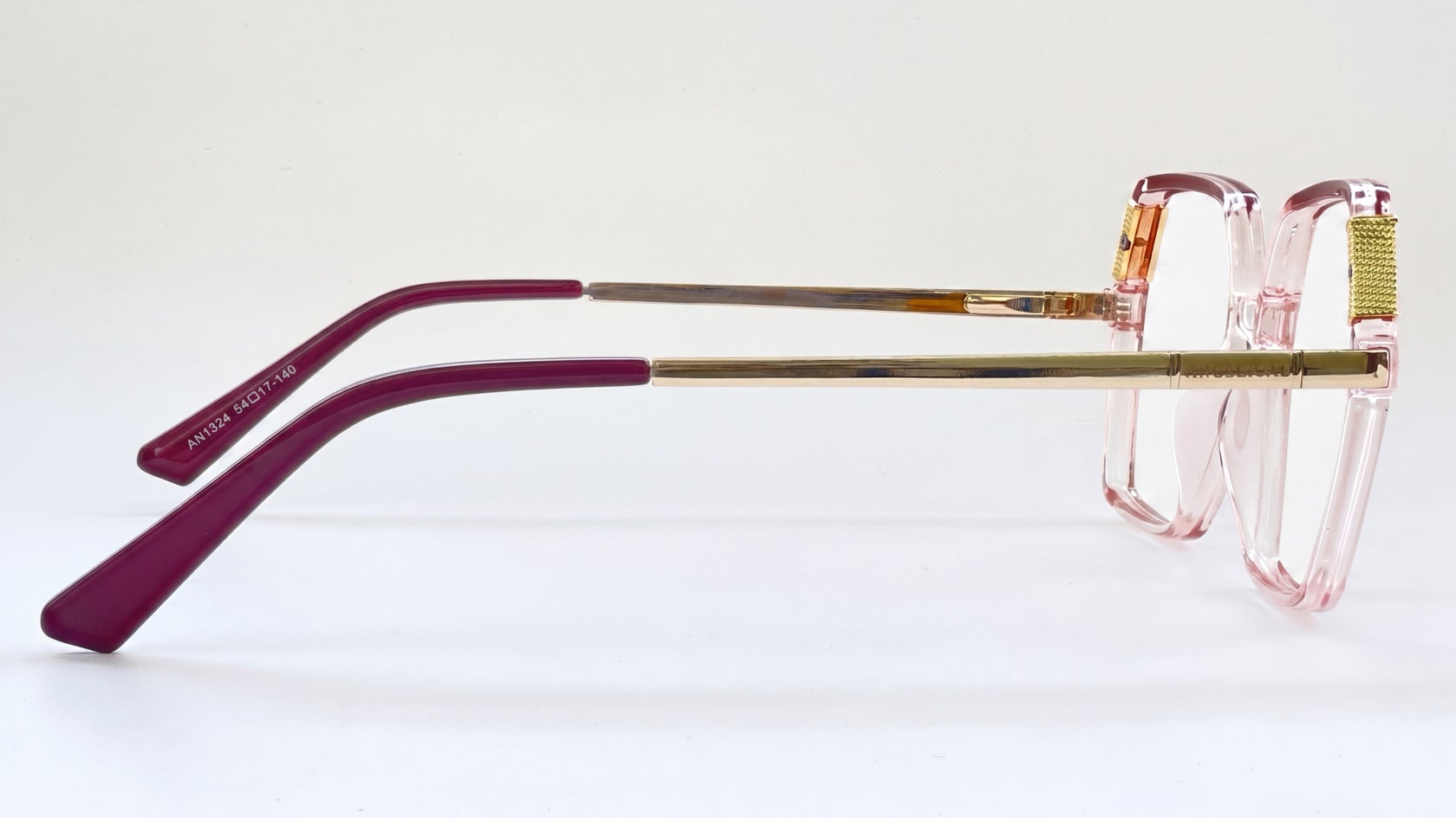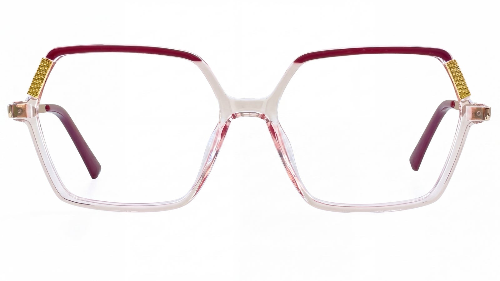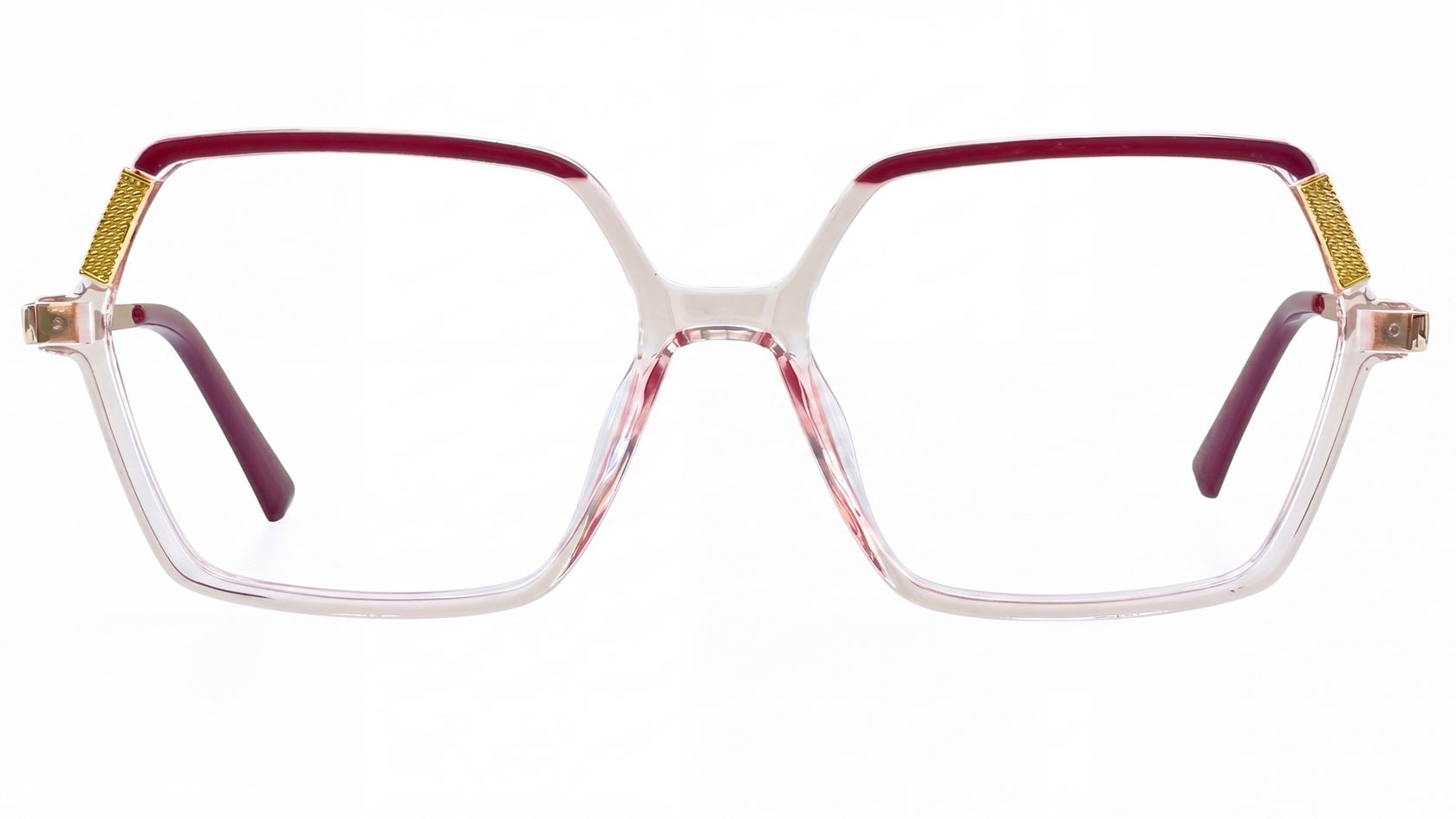 Rosado translúcido con vinotinto y dorado, de diseño elegante y femenino, con frente estilizado, detalle decorativo en los laterales y brazos delgados que le aportan un look sofisticado y distintivo.